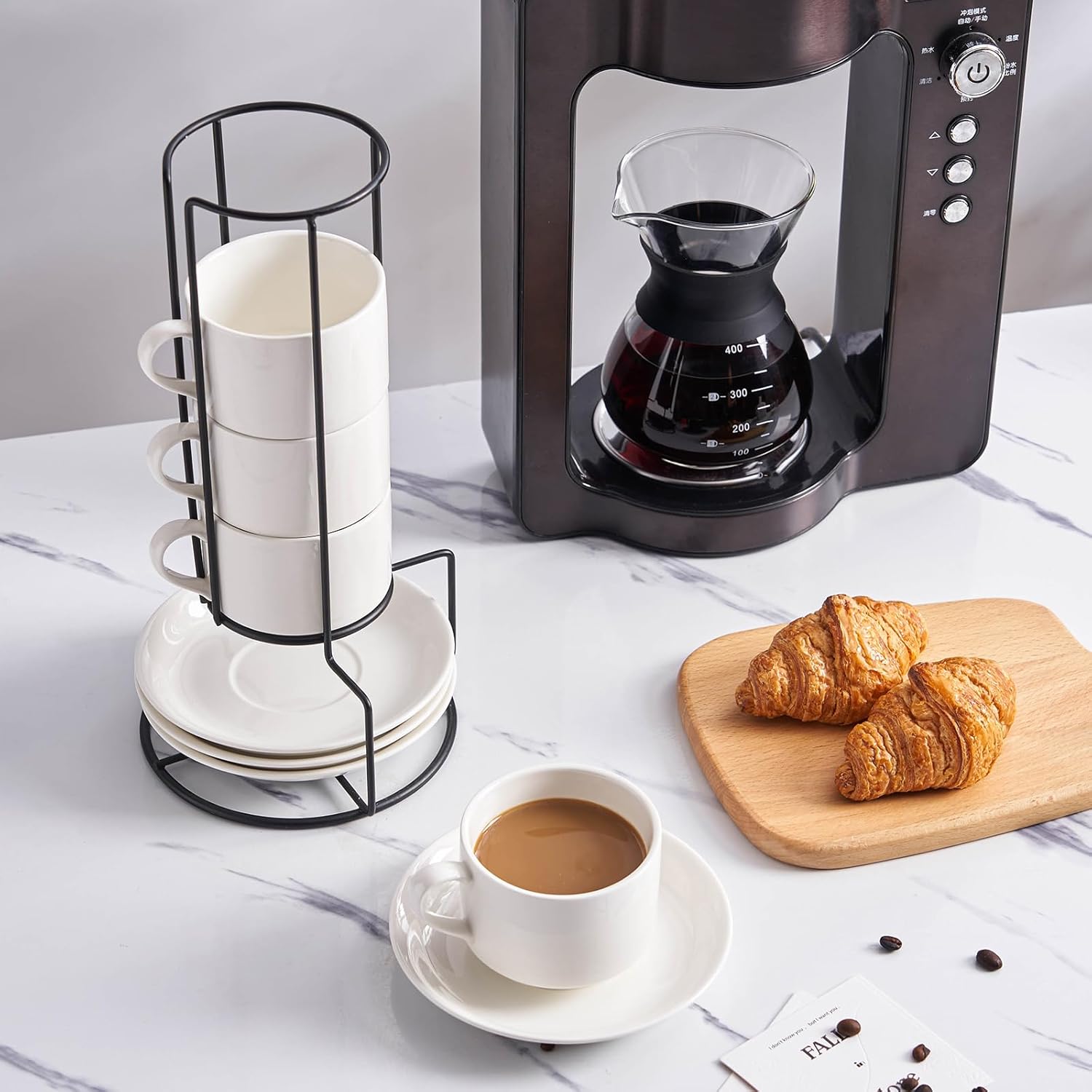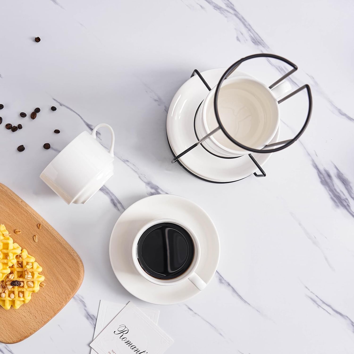 YOLIFE 8oz Porcelain Stackable Cappuccino Cups with Saucers and Metal Stand Set of 4, Coffee cups for Espresso, Specialty Coffee Drinks, Latte, Americano and Tea - White
