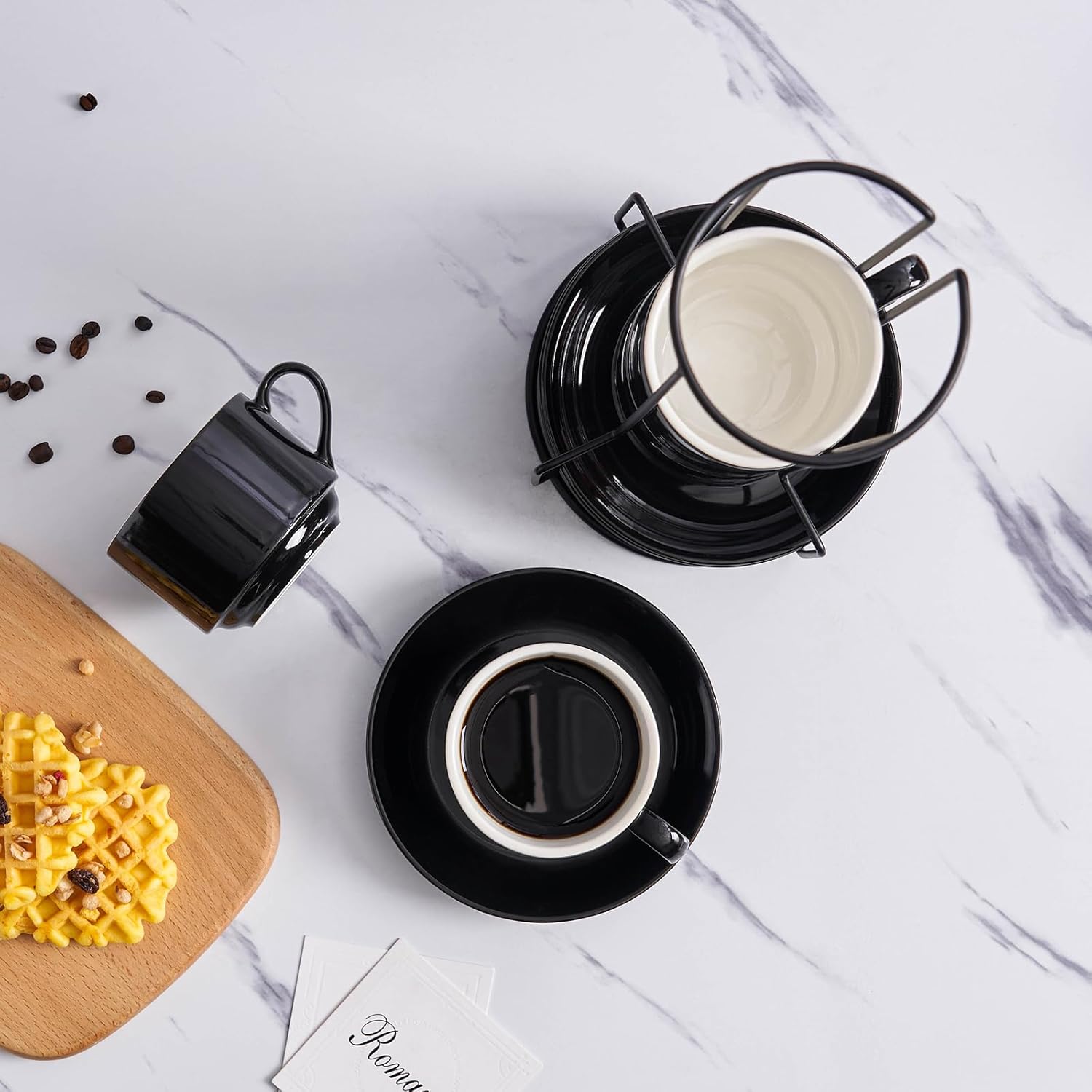 YOLIFE 8oz Porcelain Stackable Cappuccino Cups with Saucers and Metal Stand Set of 4, Coffee cups for Espresso, Specialty Coffee Drinks, Latte, Americano and Tea - Black