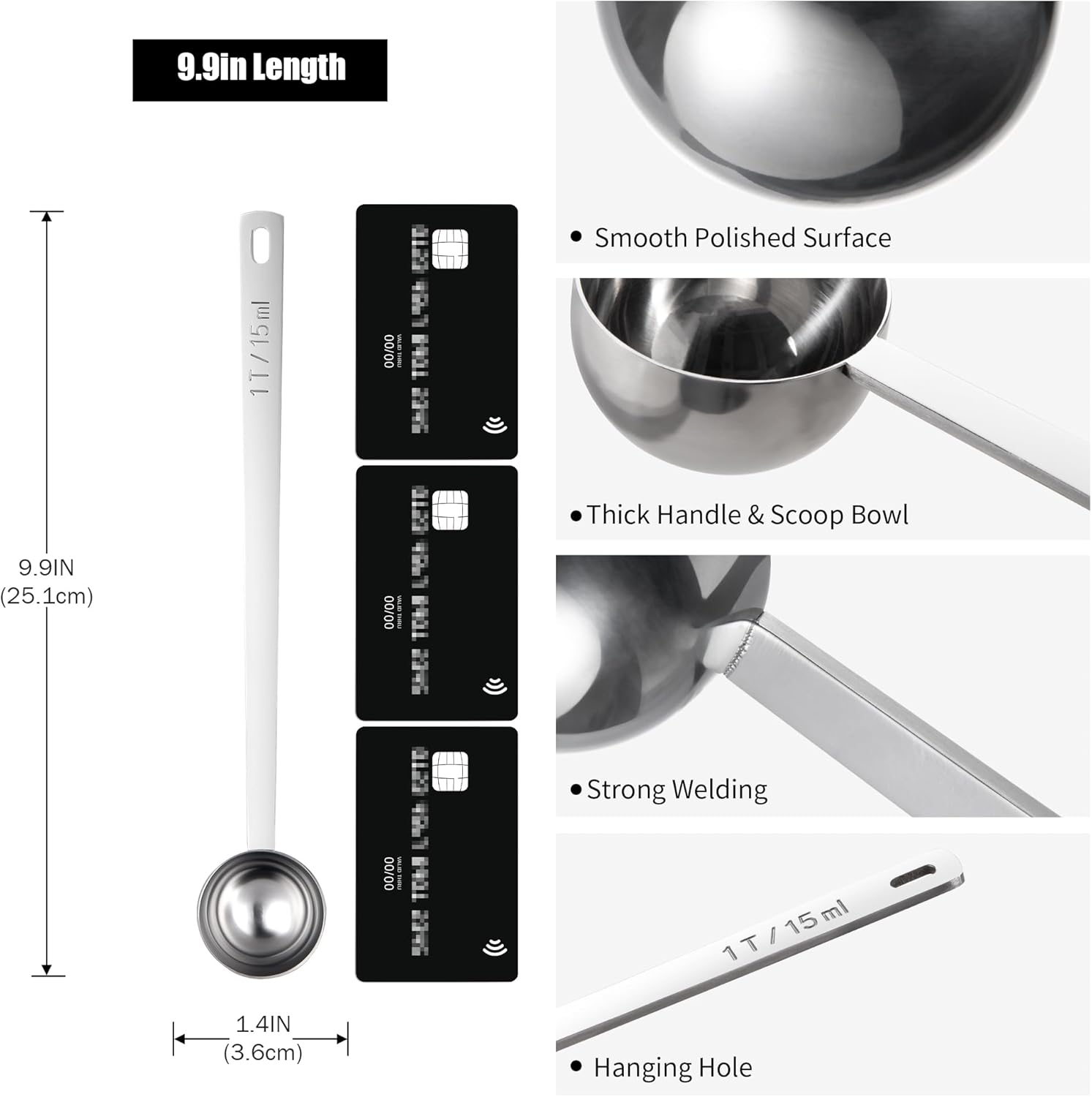 - [Why does Doosu design coffee spoon with a long handle?] Doosu 9.9in long spoon with 8.5in handle allows for easy reach into deep canisters or tall jars. No need to tip the container or dig around awkwardly, making it easier to scoop out ingredients without spilling. Unlike short-handled scoops that tend to slip into the container, our long handle tablespoon scoop always within easy reach. With a hanging hole, the coffee measuring scoop stores neatly on kitchen hooks.