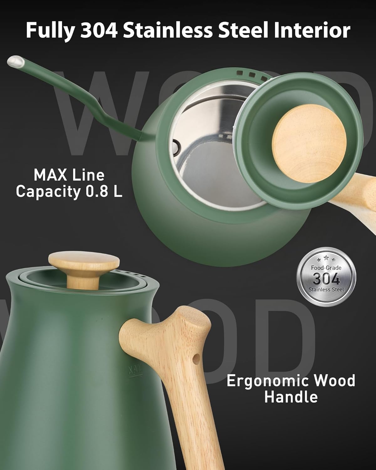 Harriet Gooseneck Electric Kettle - 1200W Fast Heat, 0.8L Stainless Steel, Precision Temp Control & Timer, Wood Handle, Pour Over Coffee and Tea, Green