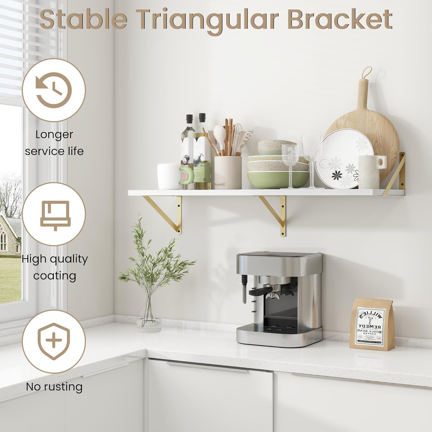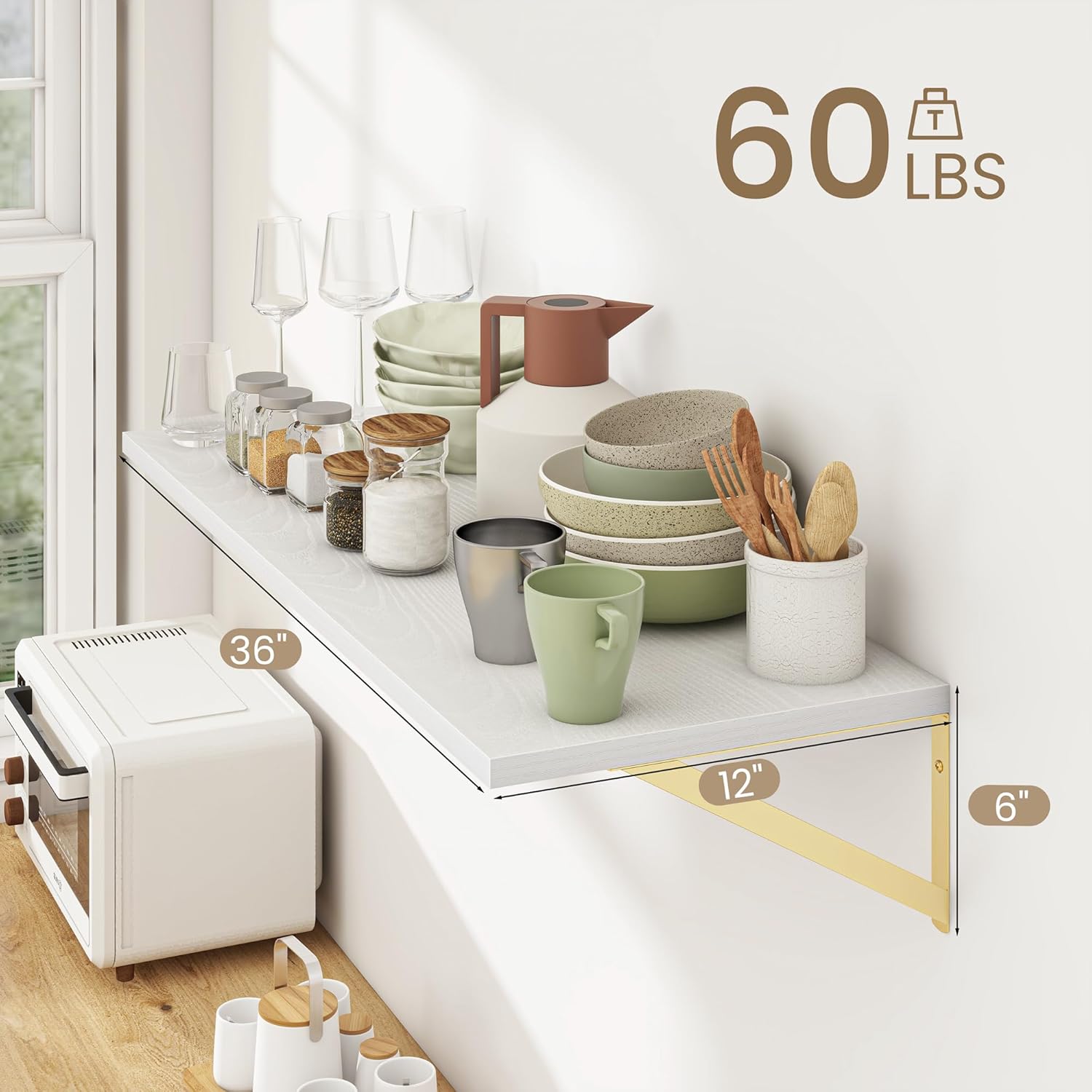 Dreamland White and Gold Shelves,36 inch Shelf, Large Floating Shelf 12 inch Deep Set of 2 for Bookshelf Living Room Bedroom Home Office Bathroom