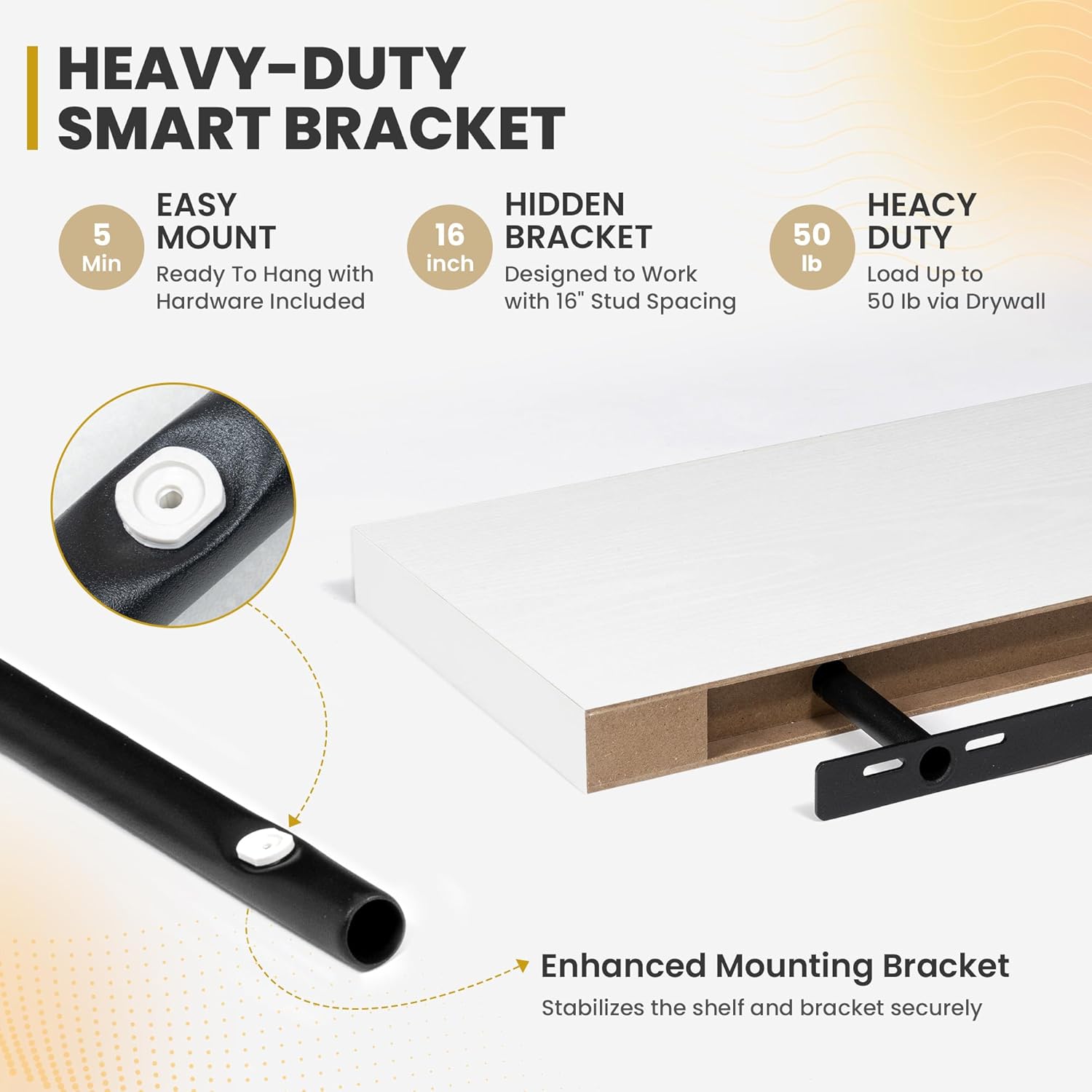 - [ROBUST & SECURE MOUNTING]: Equipped with a sturdy, hidden mounting bracket, these 24-inch floating shelves ensure solid support for your items. Designed for easy and secure installation, they come with all necessary hardware for a firm, wobble-free setup, allowing you to confidently display decor, photos, or functional items with style.