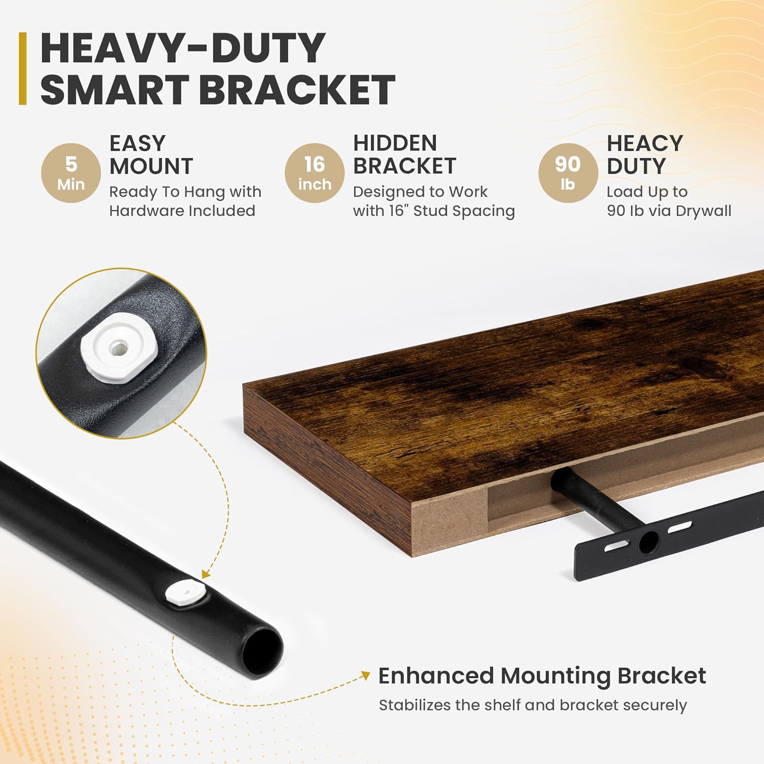 - [QUICK INSTALLATION WITH DETAILED GUIDES]: Our floating shelves include all mounting hardware and a comprehensive guide, enabling quick setup in under 10 minutes. Follow the step-by-step instructions to enjoy these beautiful shelves effortlessly, instantly upgrading your living space.