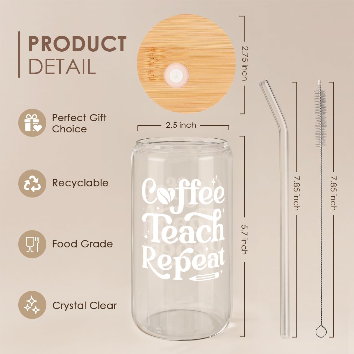 SANDJEST Teacher Glass Can, Coffee Teach Repeat Cup, Coffee Aesthetic Cups, Gift for Christmas Thanksgiving Birthday Teacher Appreciation, Gifts for Women, 16oz