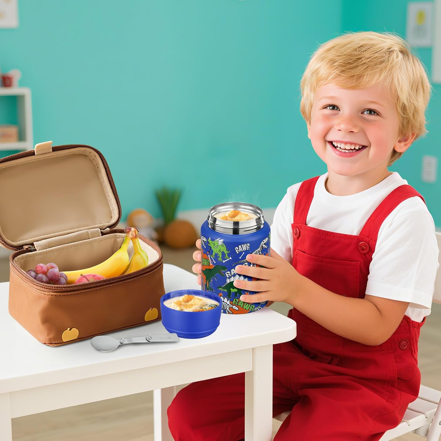 - EASY-FILL WIDE MOUTH & CLEVER ACCESSORIES - kids lunch box features a 2.75-inch opening for easy scooping, serving, and dishwasher top cleaning. Hidden grip handle on the lid for safe carrying. Stainless steel folding spoon for easy storage. Non-slip base to prevent slipping.
