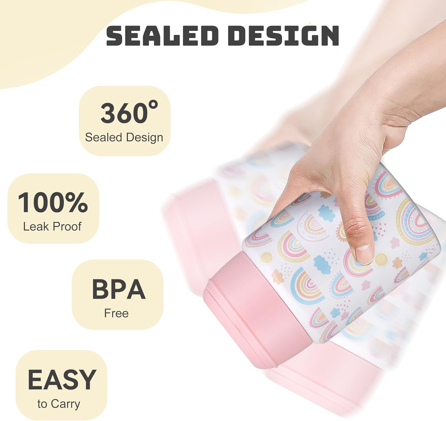- 100% LEAKPROOF GUARANTEED - EVEN INVERTED: Reinforced twist-lock lid and extra wide silicone seal form an unbreakable barrier for the kids food thermo. Pressure-tested for leakage - no spills when shaken, dropped or inverted. Easily packs condiments, smoothies and milk in one spot.