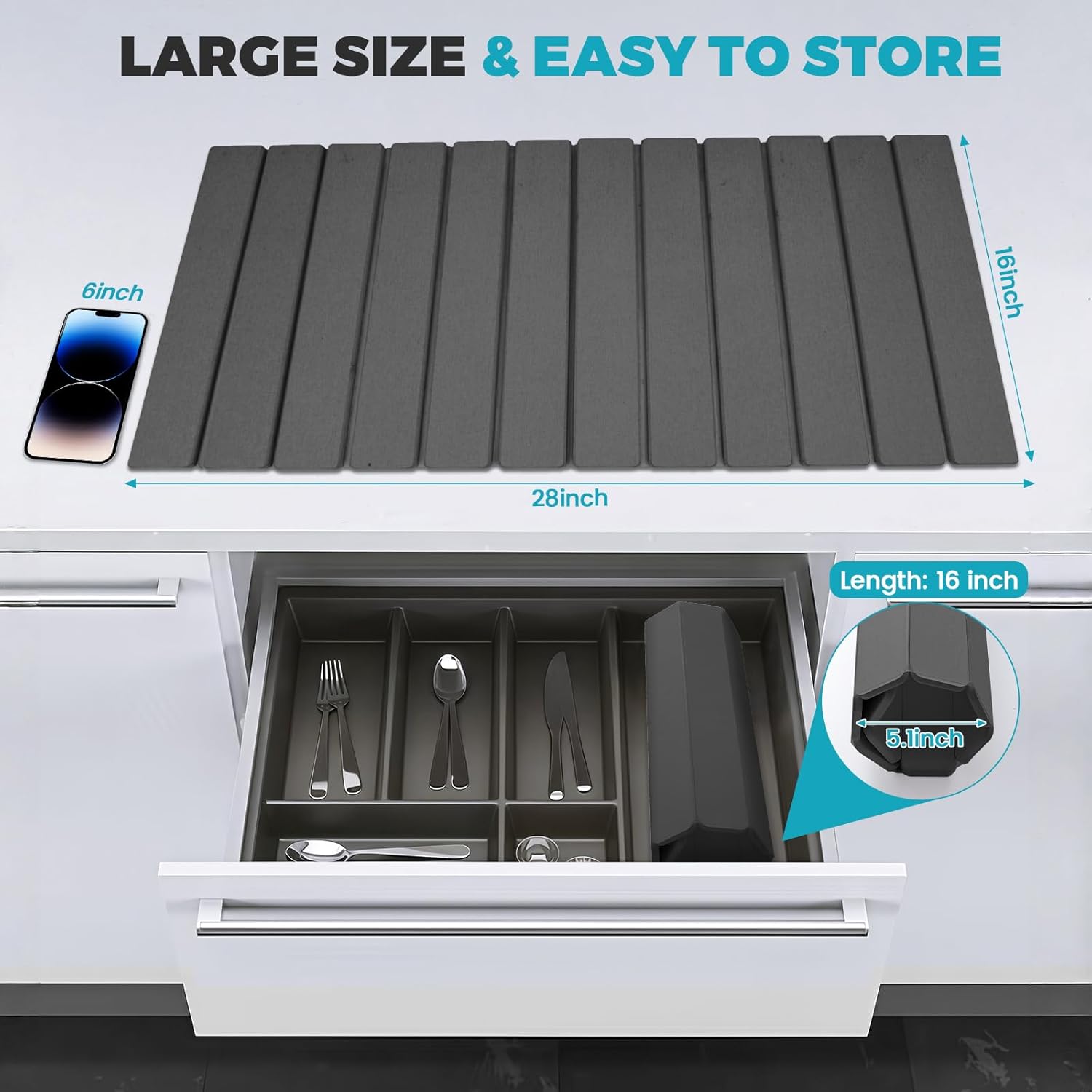 - Collapsible stone drying mat for kitchen counter: Measuring 28"(L)x16"(W) when unfolded, this collapsible stone drying mat offers ample space for your dishes. When not in use, easily store it in drawers or kitchen cabinets, maximizing your kitchen's organization