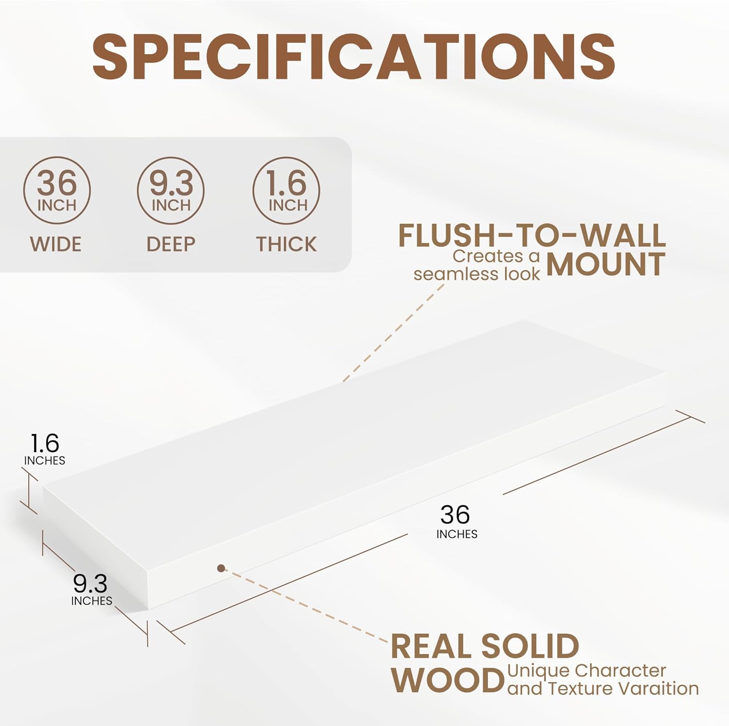 9.3 Inch Deep Floating Shelves, White Solid Wood Floating Shelf Wall Mounted, 36 x 9 Large Display & Storage Shelves for Books, Living Room, Bathroom, Rustic Wooden Wall Shelves, Heavy-Duty, Set of 2