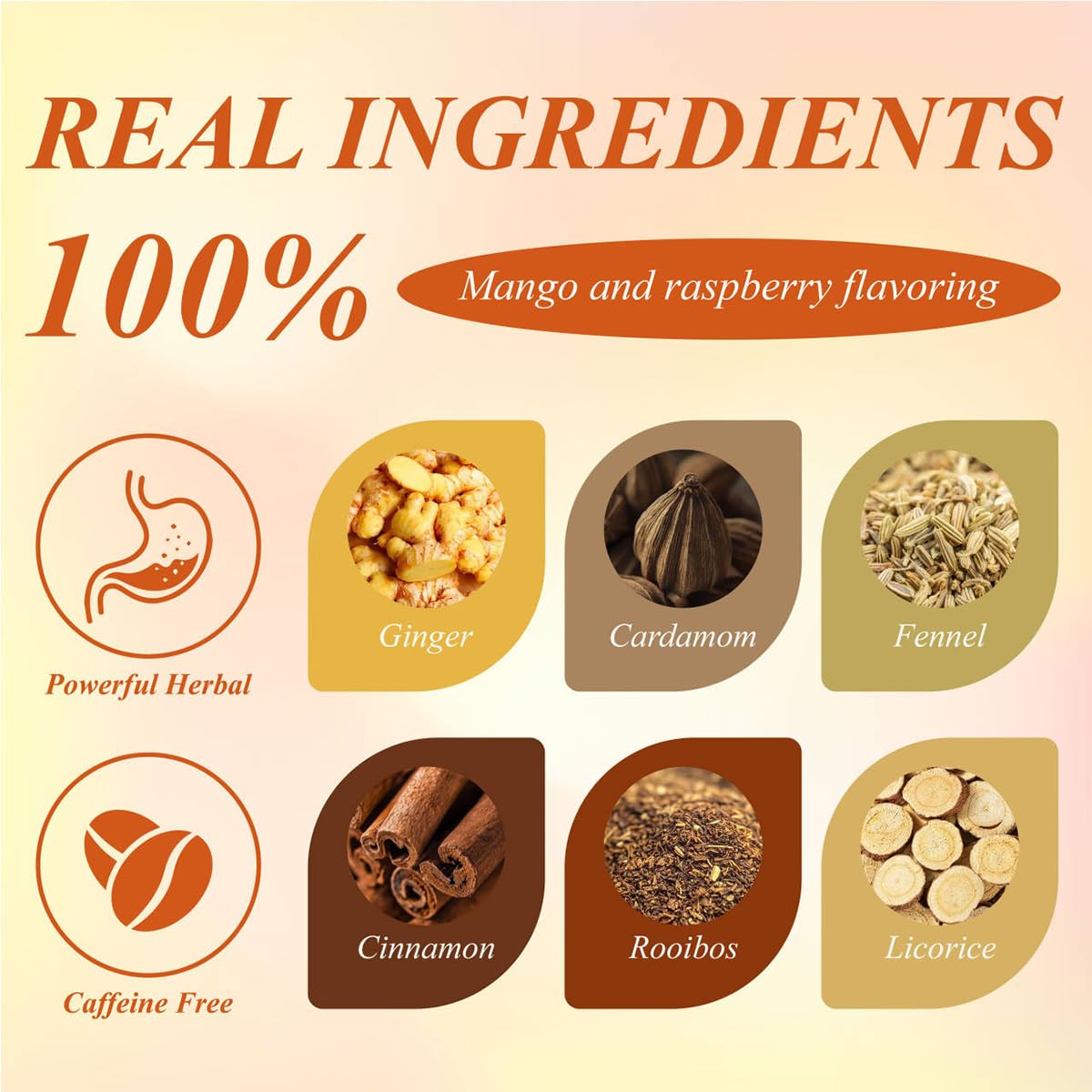 - 【Powerful Herbal Blend】Mango Ginger Tea is perfect blend of ginger, cardamom, fennel, cinnamon, rooibos, licorice, mango flavor, raspberry flavor. Caffeine-free Herbal Tea!