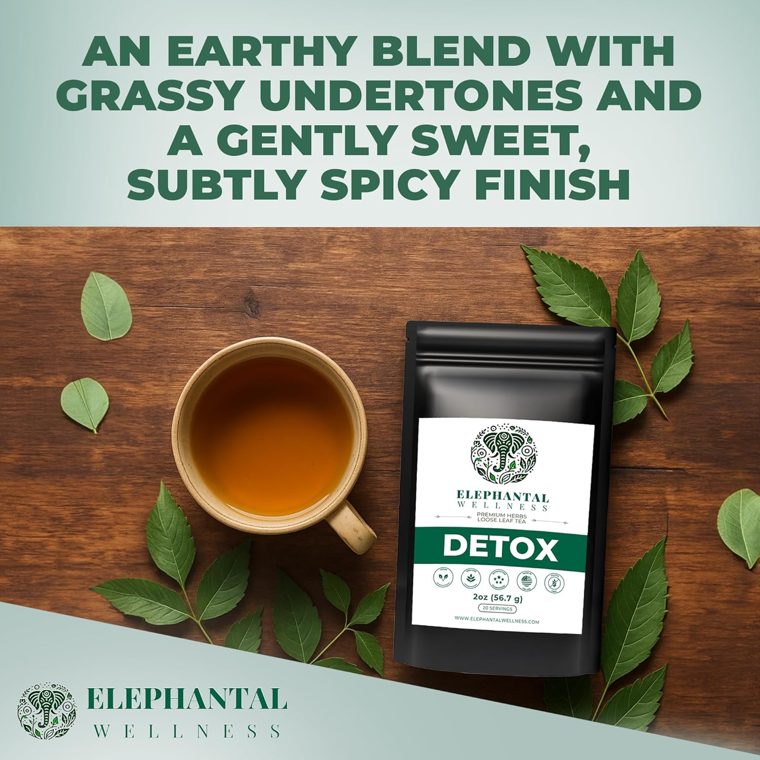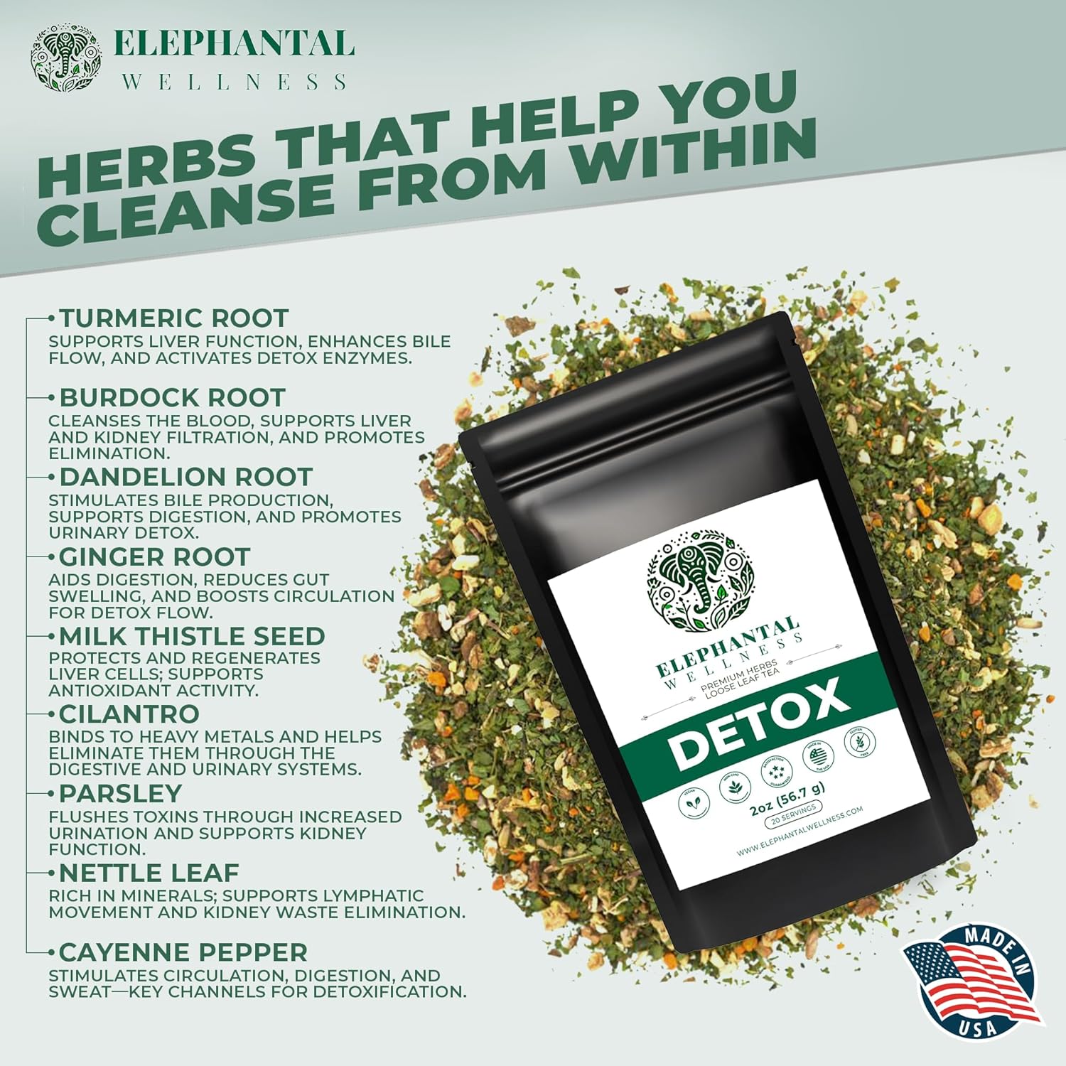 Elephantal Wellness Premium Detox Herbal Tea | Daily Liver, Kidney, Blood & Digestive Support with Turmeric, Nettle Tea, Milk Thistle, Dandelion Tea & Burdock | Handmade, Caffeine-Free Loose Leaf Blend