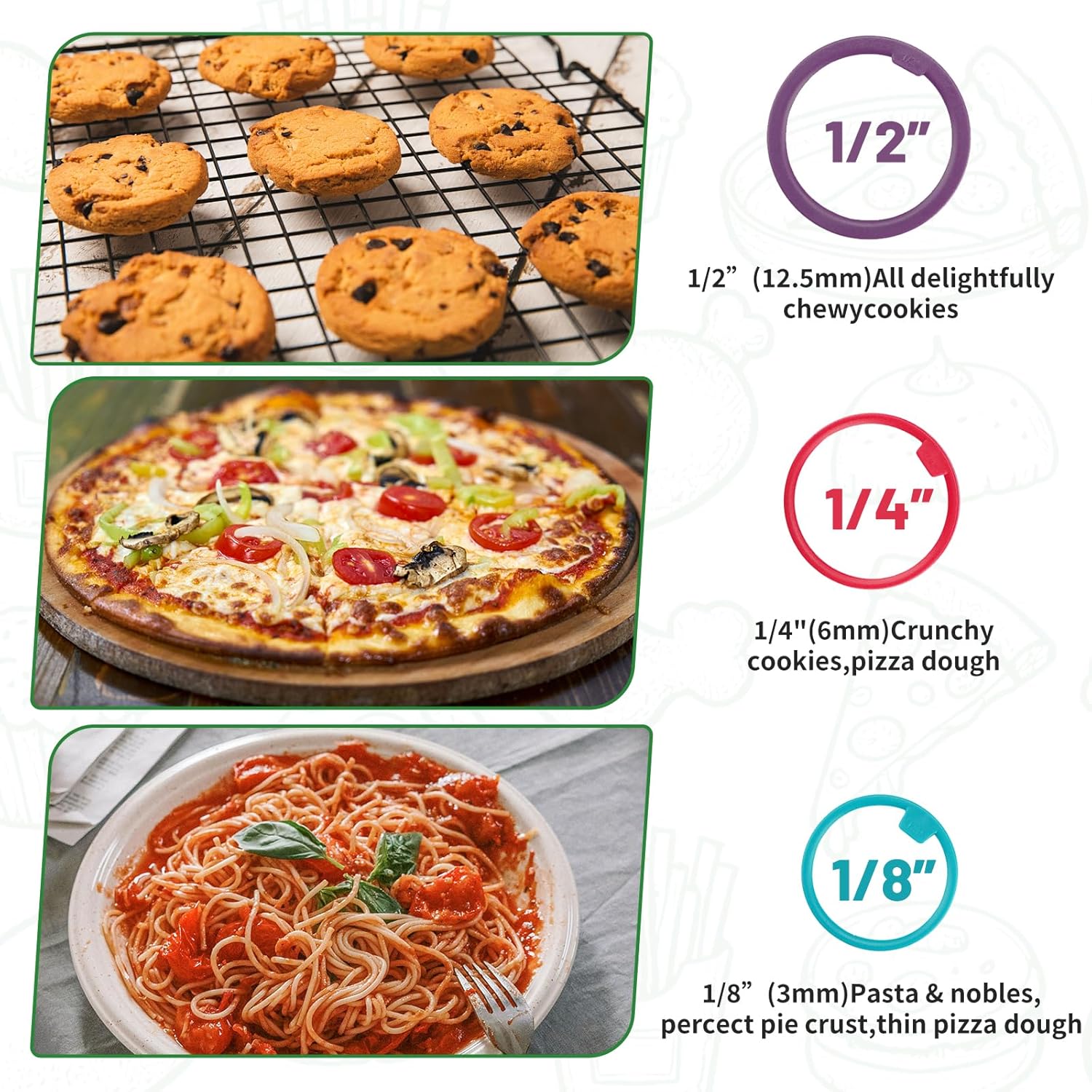 - Adjustable Rollig Pin: Adjustable Rolling Pin with Thickness Rings have 3 sizes of detachable rings: 1/2, 1/4 and 1/8 inch are used to knead the dough to the expected thickness easily of cooking. The stainless steel rolling pin in can be used to create any mixture you can imagine, such as pizza and pie, egg tart, bread, cookie, dumpling, pancake, pastry and other foods. And moreover you can teach your children to bake in the kitchen with it