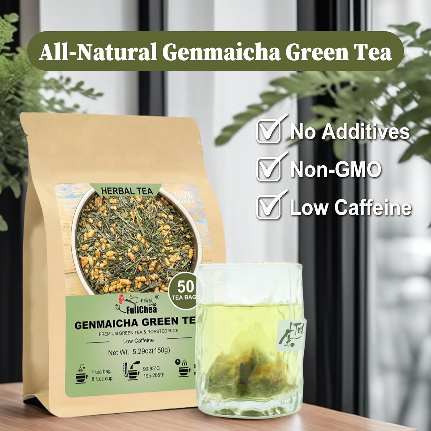 FullChea - Genmaicha Tea bags, 50 Teabags - Genmaicha Green Tea with Roasted Rice, Nutty & Refreshing - Low Caffeine - Soothing & Digestive, Perfect for Daily Relaxation