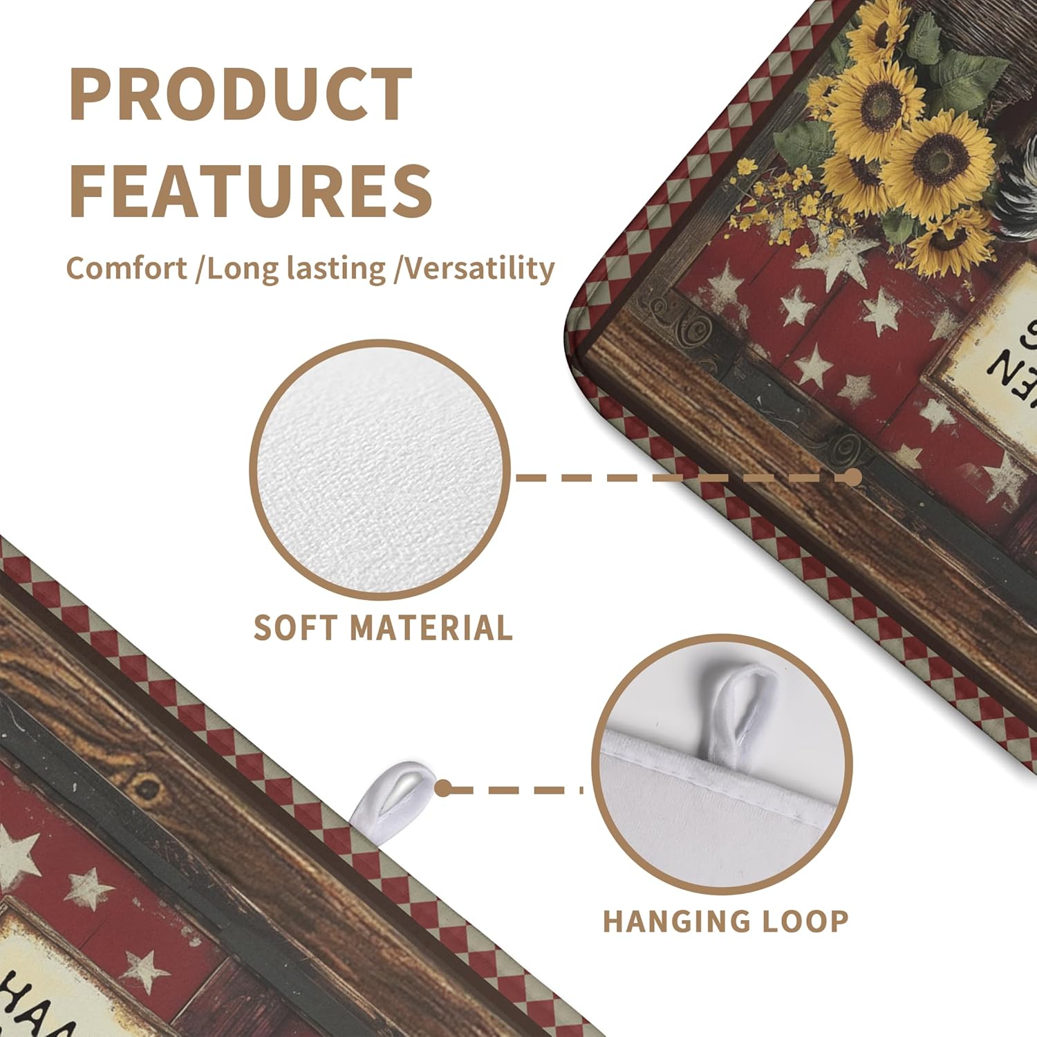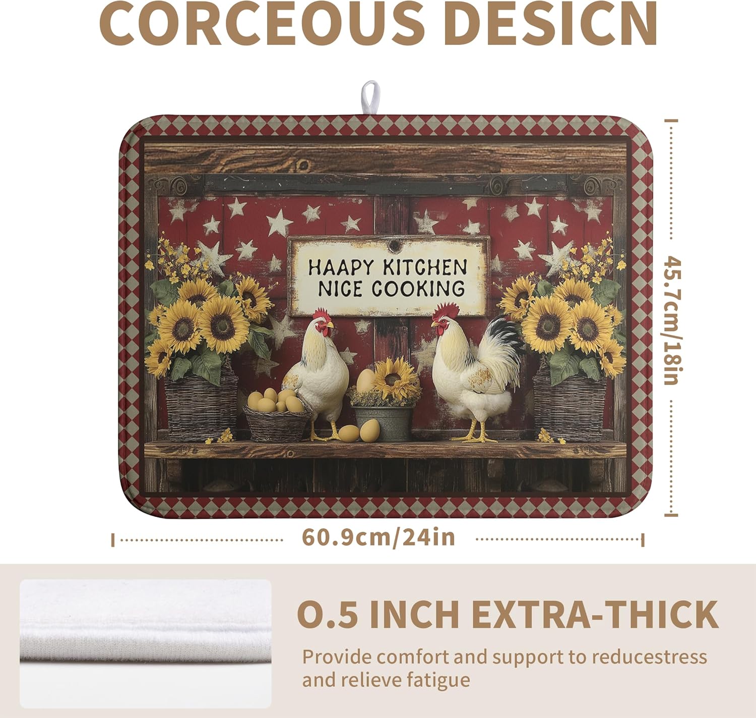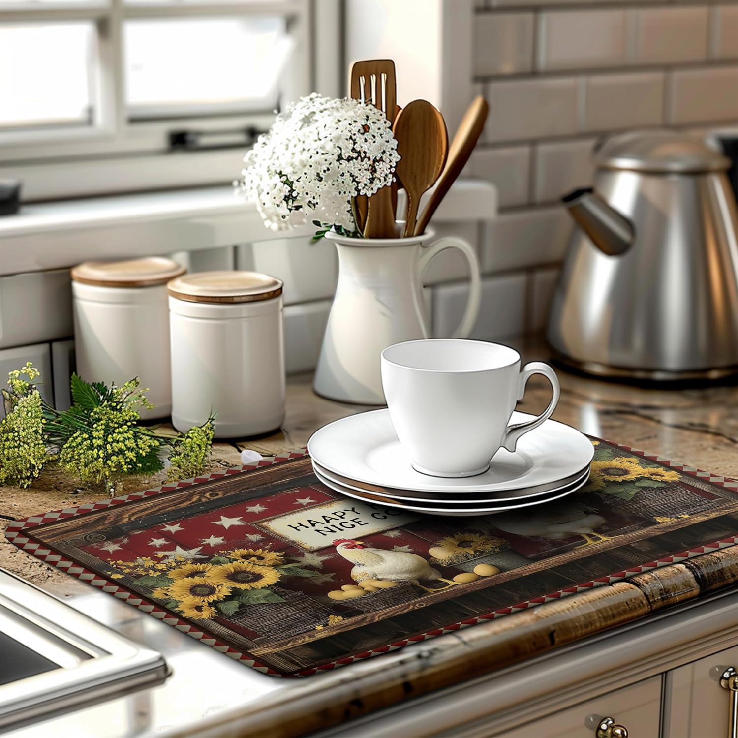 - [Space Saving]: This Summer Sunflower Farmhouse dish drying mat lightweight absorbent dish drying mat has a webbing lanyard in the middle of the horizontal side for hanging, and Vintage Rooster Farmhouse fall dish drying matt kitchen counter can also be folded and thrown into a drawer or stuffed elsewhere.