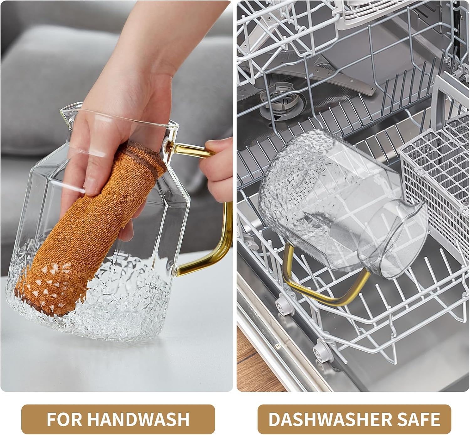 - High Borosilicate Glass: The water pitcher is made of heat resistant Borosilicate glass and can withstand temperatures -4 to 302 degree F, so you can also use it to hold and dispense hot and cold liquids safely than other materials. Drinking from glass tastes better, so get rid of your dingy plastic pitchers and enjoy a better tasting beverage with our water carafe. The glass pitcher with lid doesn't stain, and won't absorb odor or color, can ensure years of use.