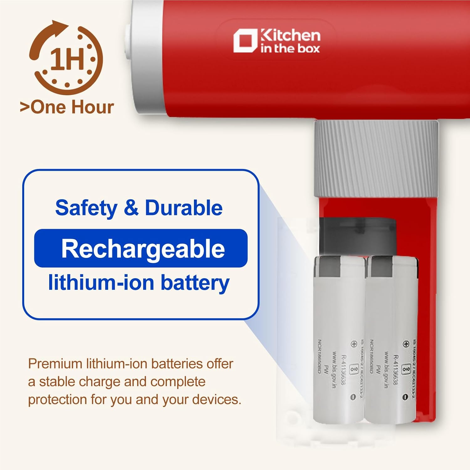 - Safe & Durable Battery - Our compact cordless mixer for baking equipped with high quality lithium-ion battery, providing stable charging and comprehensive protection for you and your device. Large-capacity battery can be used for more than 1 hour on a full charge
