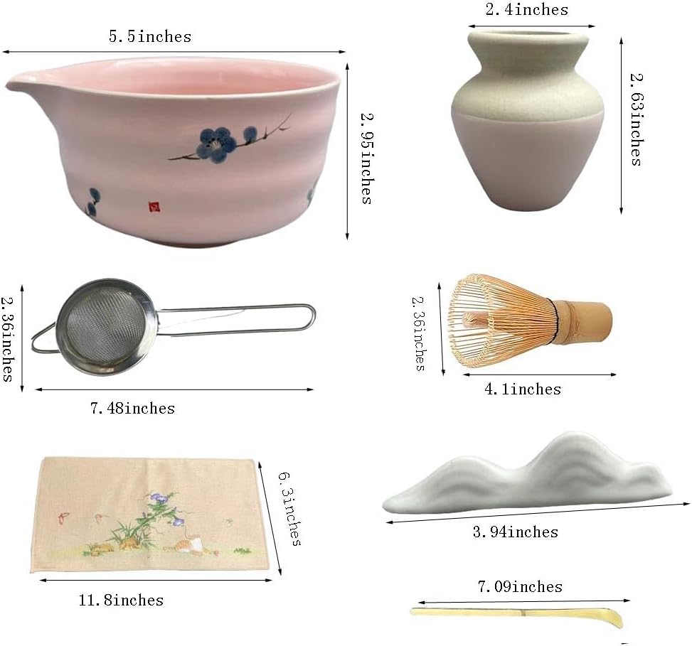 - 7-piece matcha whisk set: 1 * ceramic bowl (chawan) 510ml/18oz, 1 * bamboo whisk, 1 * bamboo spoon (chashaku), 1 * ceramic whisk stand, 1 * ceramic spoon holder, 1 * cotton tea cloth (chakin), 1 * matcha powder sifter. All accessories included