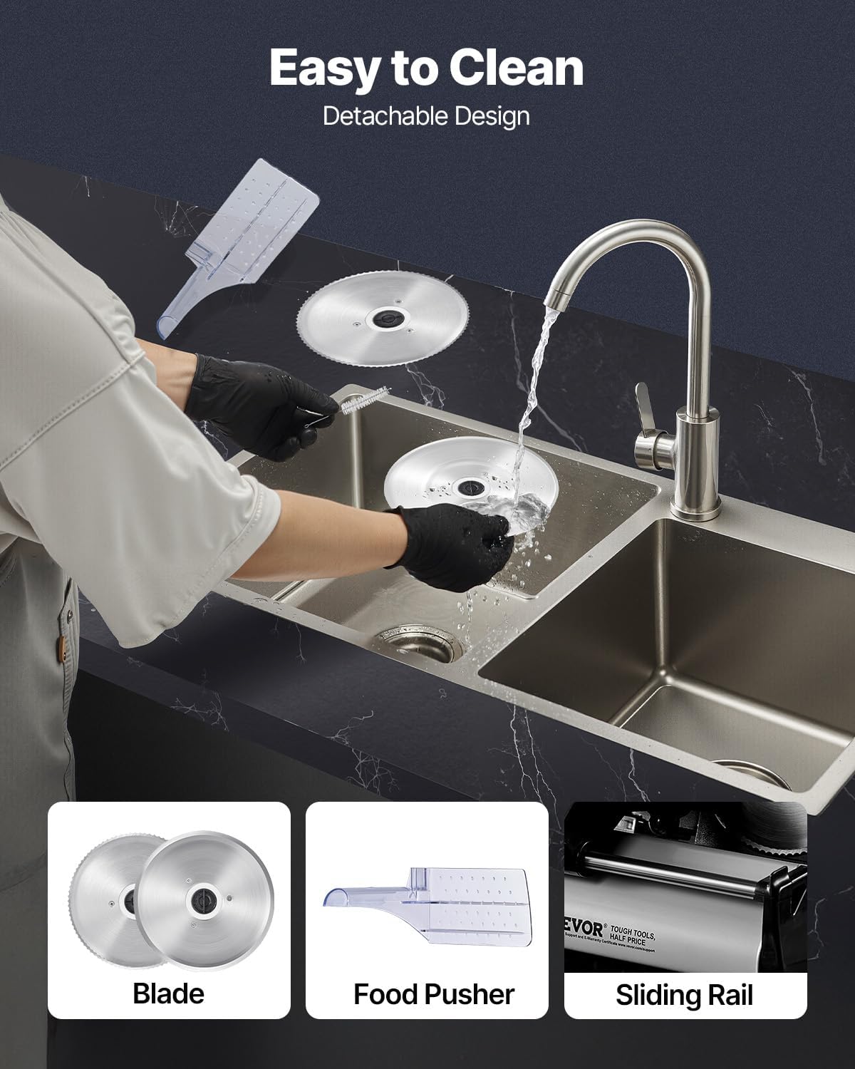 - Disassemble for Easy Cleaning: Crafted with food-grade materials for all food-contact parts, our meat slicer machine is designed for your convenience. It features a stainless steel tray that is easy to clean. The blade, food rack, and food pusher are easily detachable, making post-use cleaning a snap and keeping your kitchen spotless.