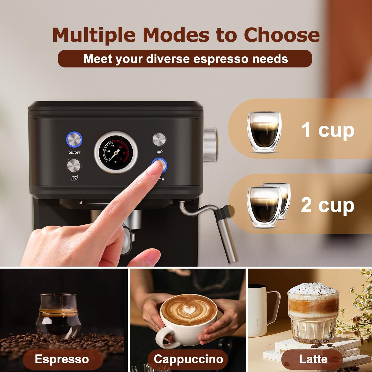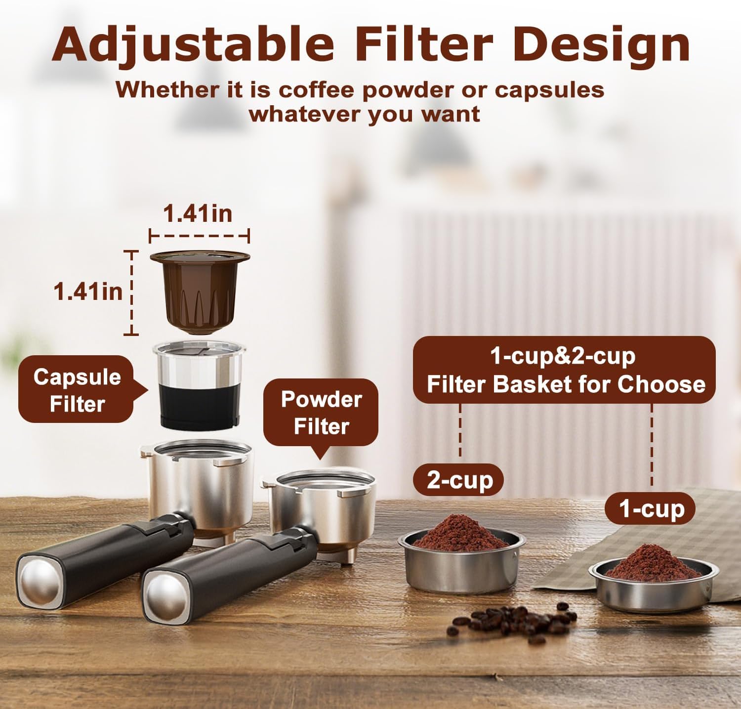 - 🔄【Multiple Espresso Options】- The expresso machine features two intuitive button modes (1-cup and 2-cup) for effortless brewing. It comes with both a powder basket and a capsule basket, allowing you to seamlessly switch between coffee grounds and capsules based on your preference. The powder filter basket offers 1-cup/2-cup sizes, ensuring versatility for all your espresso cravings!