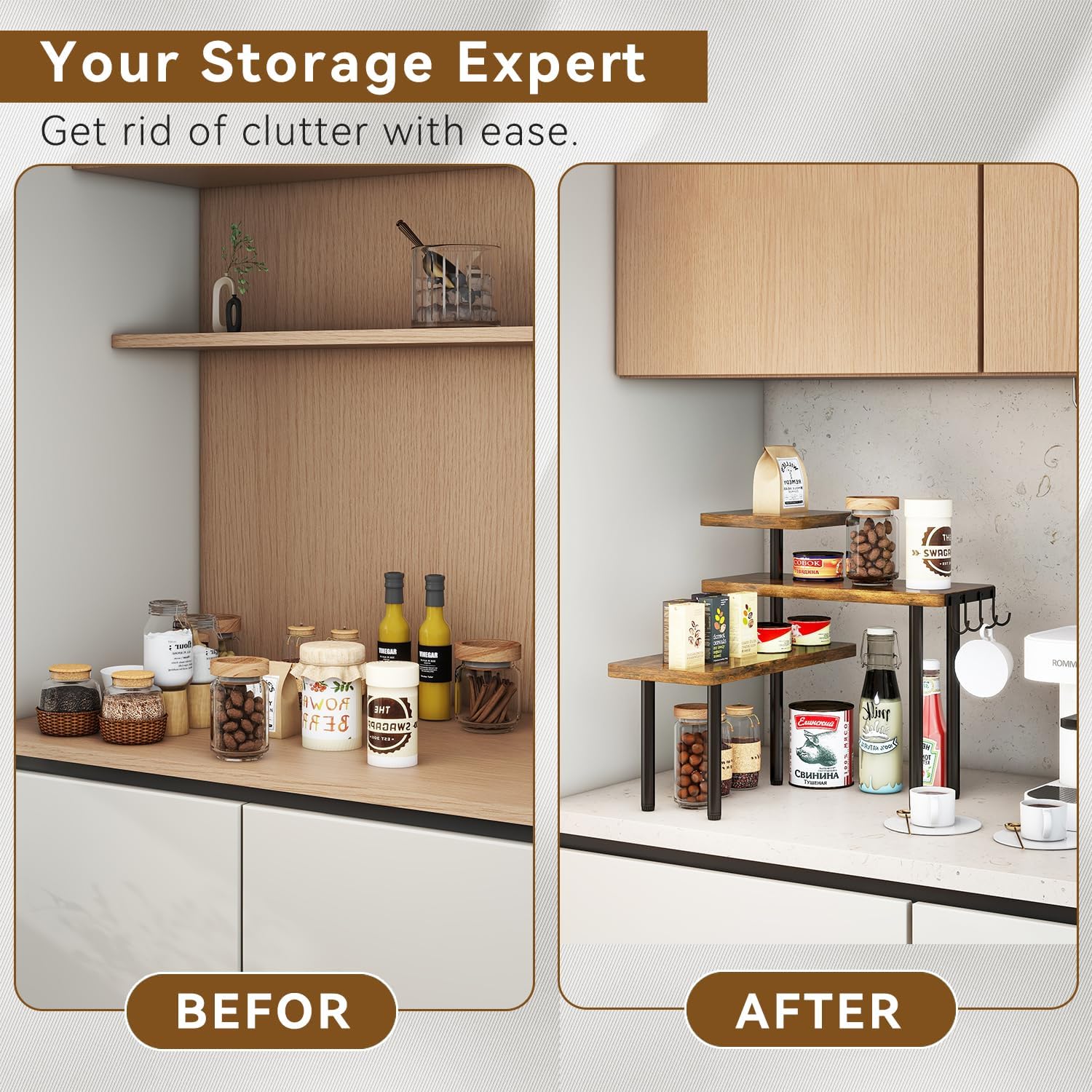 IBUYKE Countertop Organizer,3-Tier Spice Racks,Kitchen Counter Corner Shelf,4 Side Hooks,Adjustable Countertop Shelf for Kitchen, Bathroom, Coffee Bar, Cabinet, Desk,Rustic Brown,TLJ023H