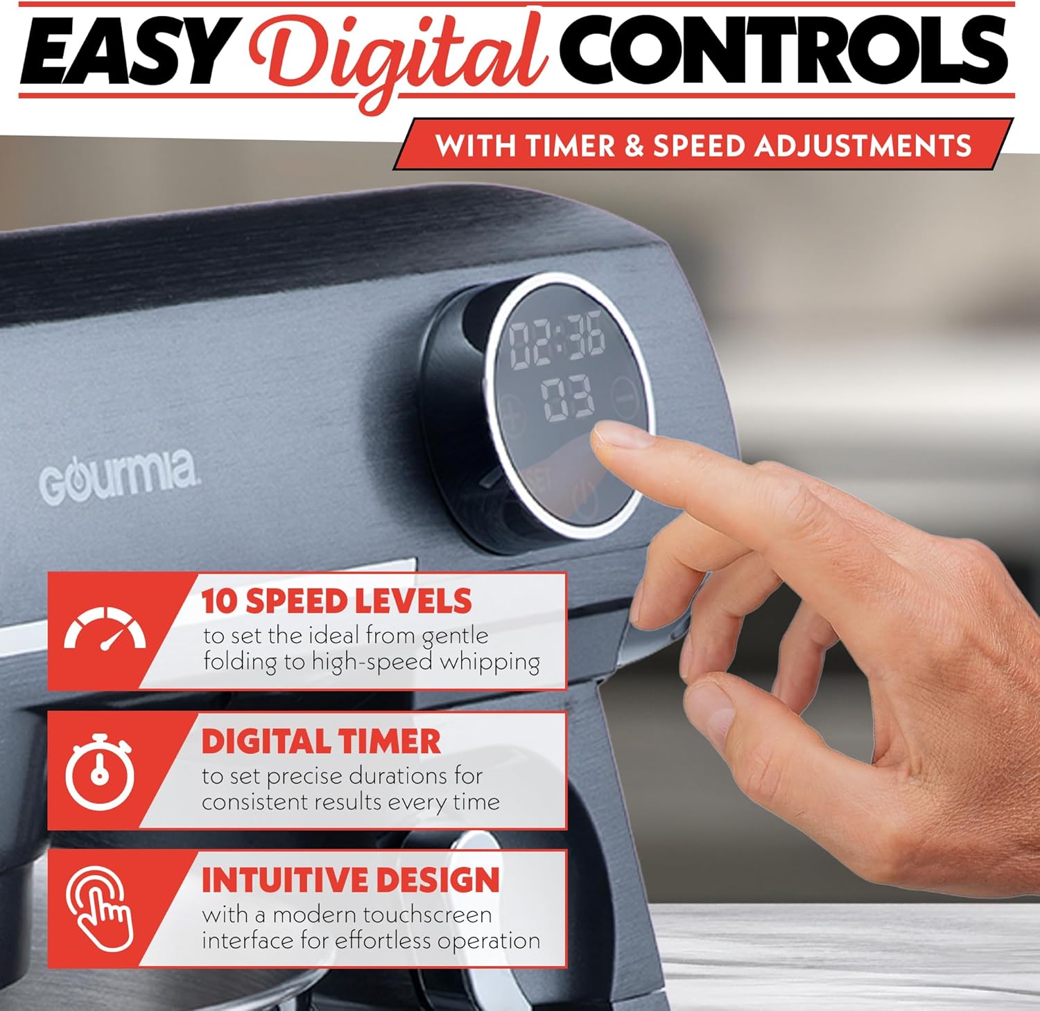 - LED DISPLAY WITH TIMER FUNCTION – Get more done in the kitchen with a timer that stops the machine automatically when time is up. Choose your speed level then set it anywhere from 10 seconds to 50 minutes.