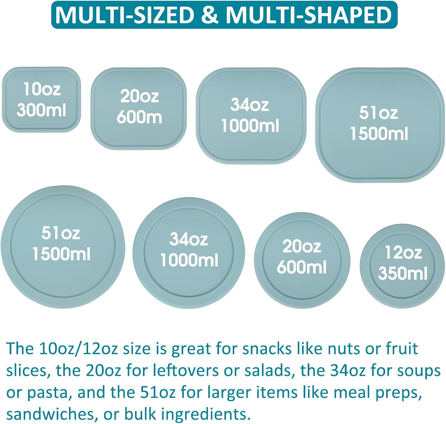 - 【NEST & STACK】Food storage silicone containers are ingeniously crafted to save your space. Stack them on top of each other in your freezer to make the most of vertical storage, and nest them away when not in use. A fantastic solution for RV, small kitchen and traveling. Rectangular: 10/ 20/ 34/ 51fl.oz; Circular: 12/ 20/ 34/ 51fl.oz. Different shapes and sizes meet all your storage needs. Small containers for snack like nuts or fruit slices, and large for salad, soup, pasta, sandwich, meal prep