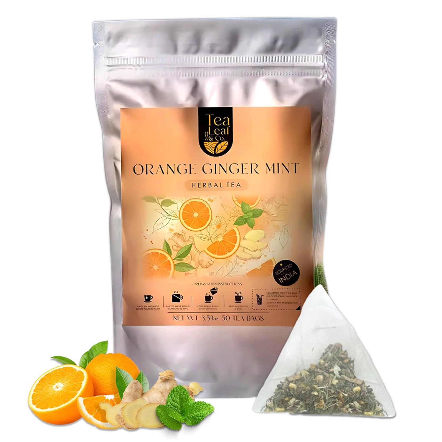 Tealeaf & Co. Orange Ginger Mint Tea Blended with Fresh Herbs and Spices - Herbal Tea Bags with Orange Peel, Ginger, Star Anise, Spearmint & Lemon Grass - Low Caffeine - Gluten Free - 50 Teabags