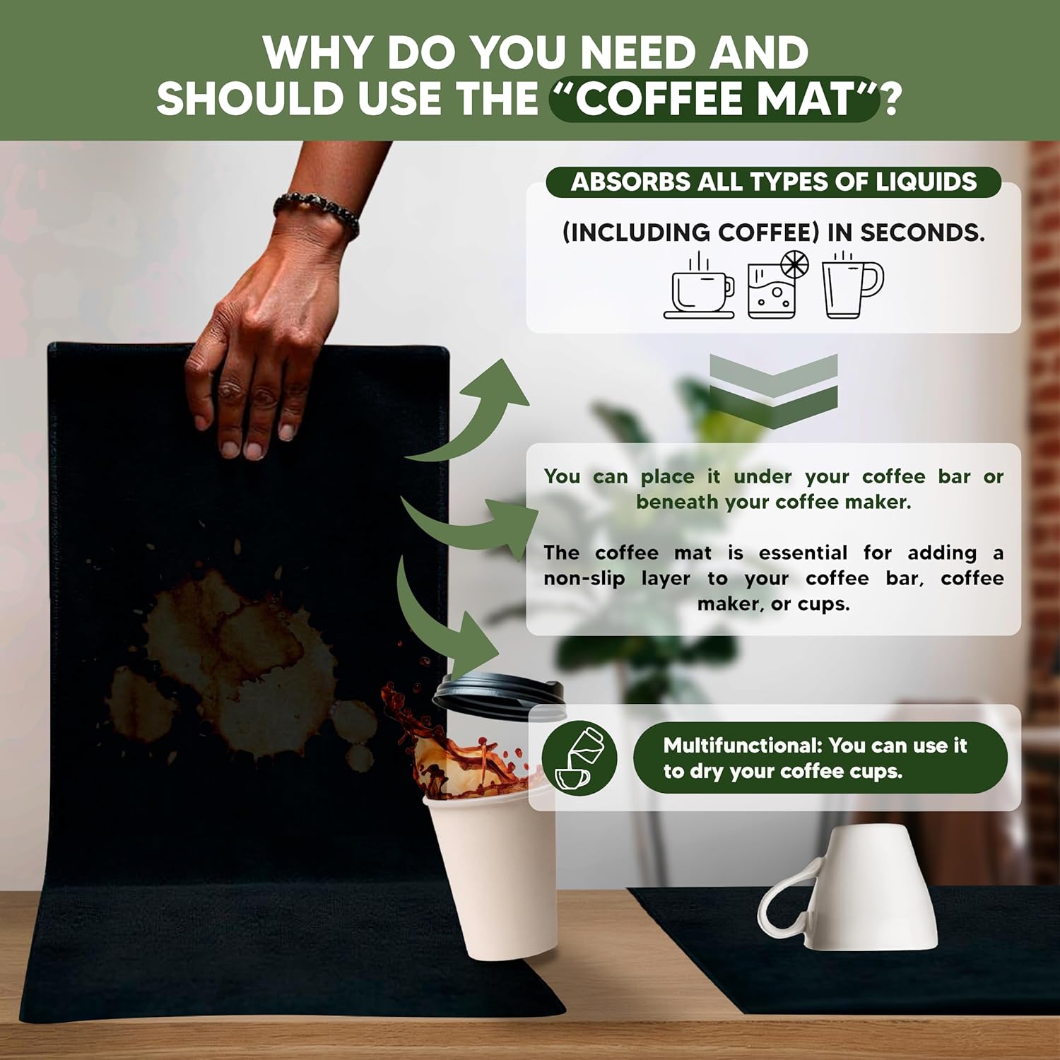 - 🧼 ENJOY A CLEANER COFFEE STATION WITH THE INCLUDED COFFEE MAT – The absorbent coffee mat prevents water stains, coffee drips, and spills from ruining your countertop, making cleanup effortless while maintaining a tidy and stylish coffee bar.