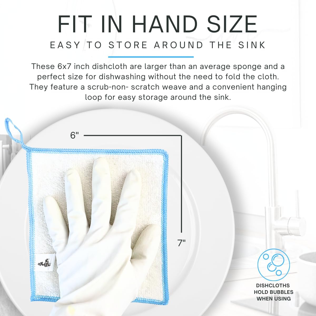 - DESIGNED FOR DISHES – 6x7 inch bamboo-rayon dishcloths hold plenty of soap and water, yet wring out easily with one hand. Highly absorbent to reduce drips and splashes.