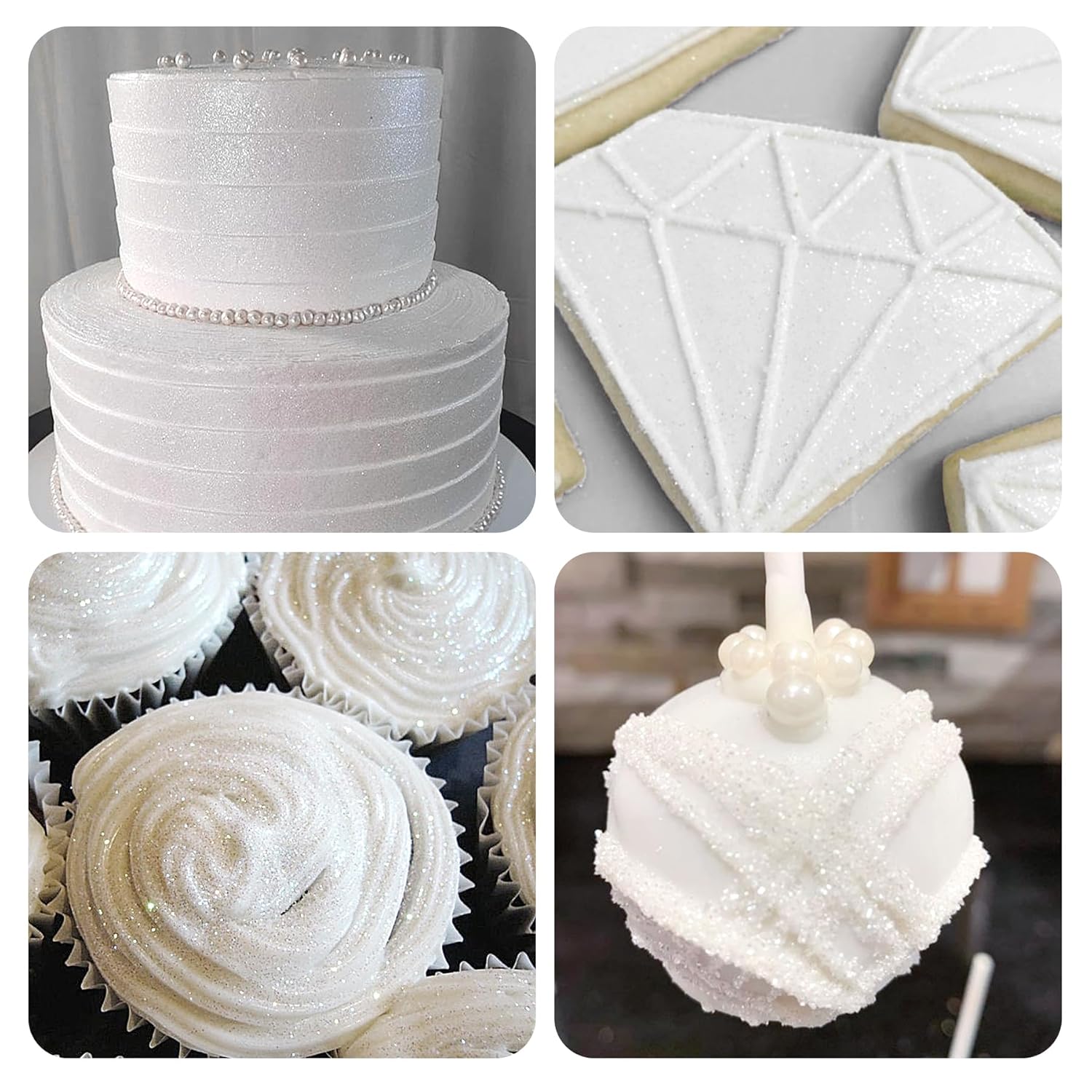 - Wide Application: The vibrant and soothing white edible glitter is perfect desserts like for cake pops, cupcakes, chocolate and cookies. Besides this, the edible glitter white is perfect for cocktails, champagne and all other kind of drinks.