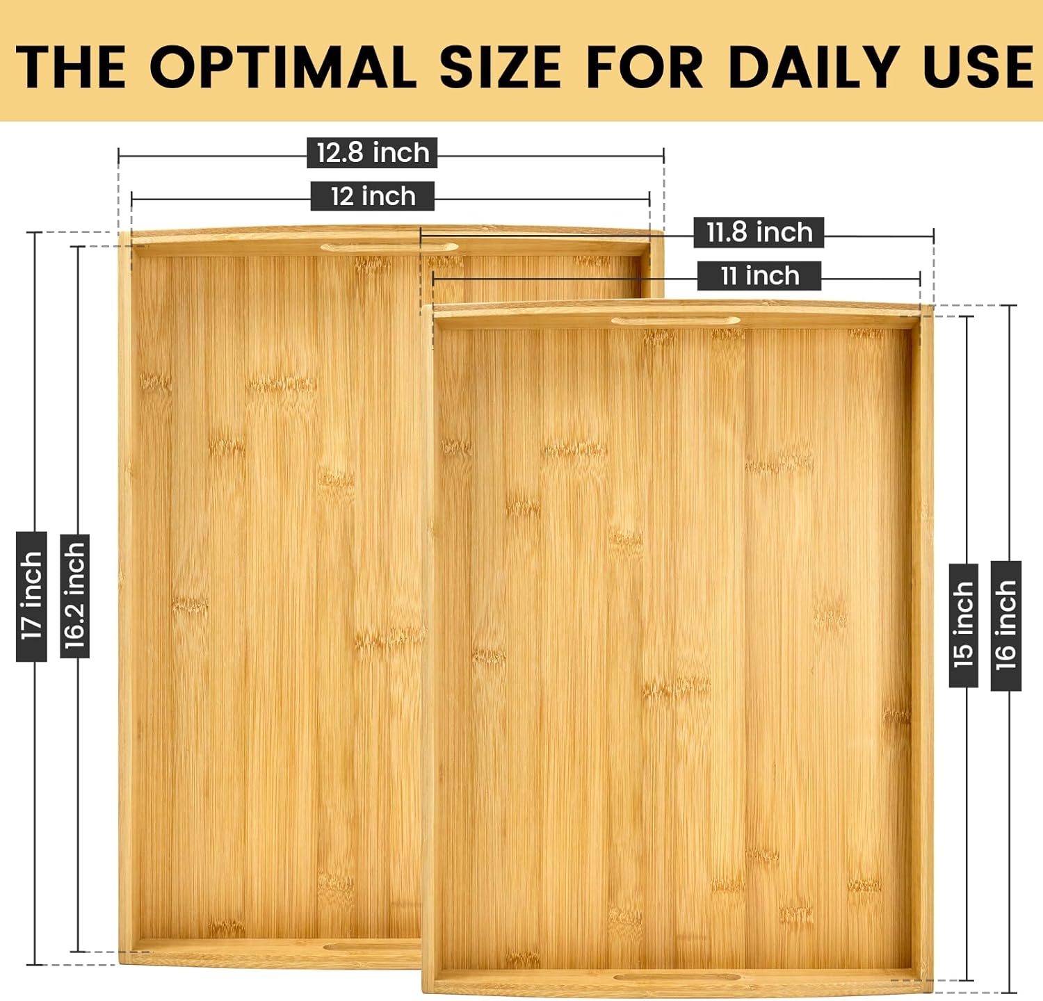 Bamboo Serving Tray with Handles Set of 2 - Decorative Wooden Trays for Eating, Working, and Storing, Suitable for Use in Bedroom, Living Room, Kitchen, Bathroom, Outdoor Scenarios and More