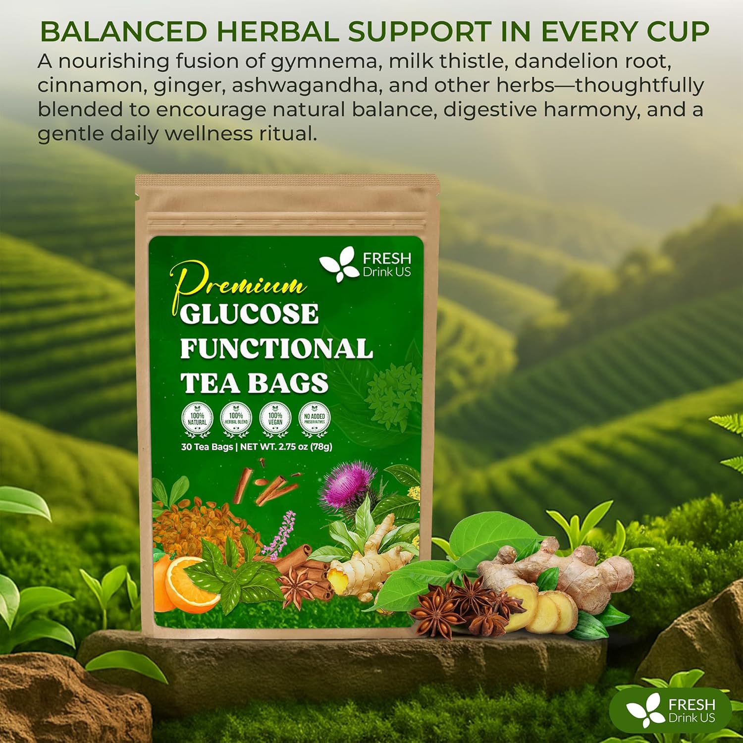 FreshDrinkUS, Premium 30 Tea Bags Glucose Functional Tea – Herbal Blend with Gymnema, Cinnamon, Bitter Melon, Tulsi & More –– Caffeine-Free. Sugar-Free. Gluten-Free. Vegan
