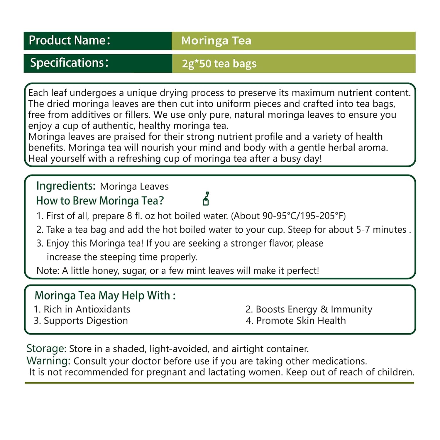 - 【Enjoy Convenience】: With 50 tea bags in a resealable pack, simply use one tea bag to enjoy a cup of healthy herbal tea. Our excellent packaging ensures freshness and readiness from the first to the last cup of moringa tea.
