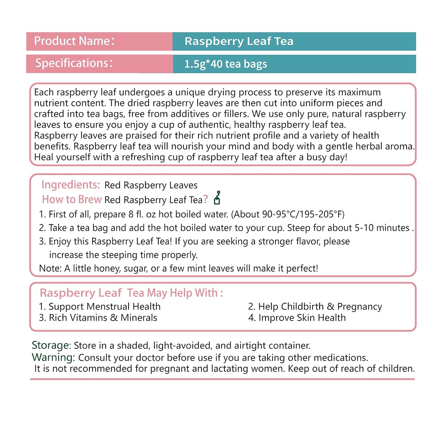 - Flavor : Raspberry Leaf Tea
