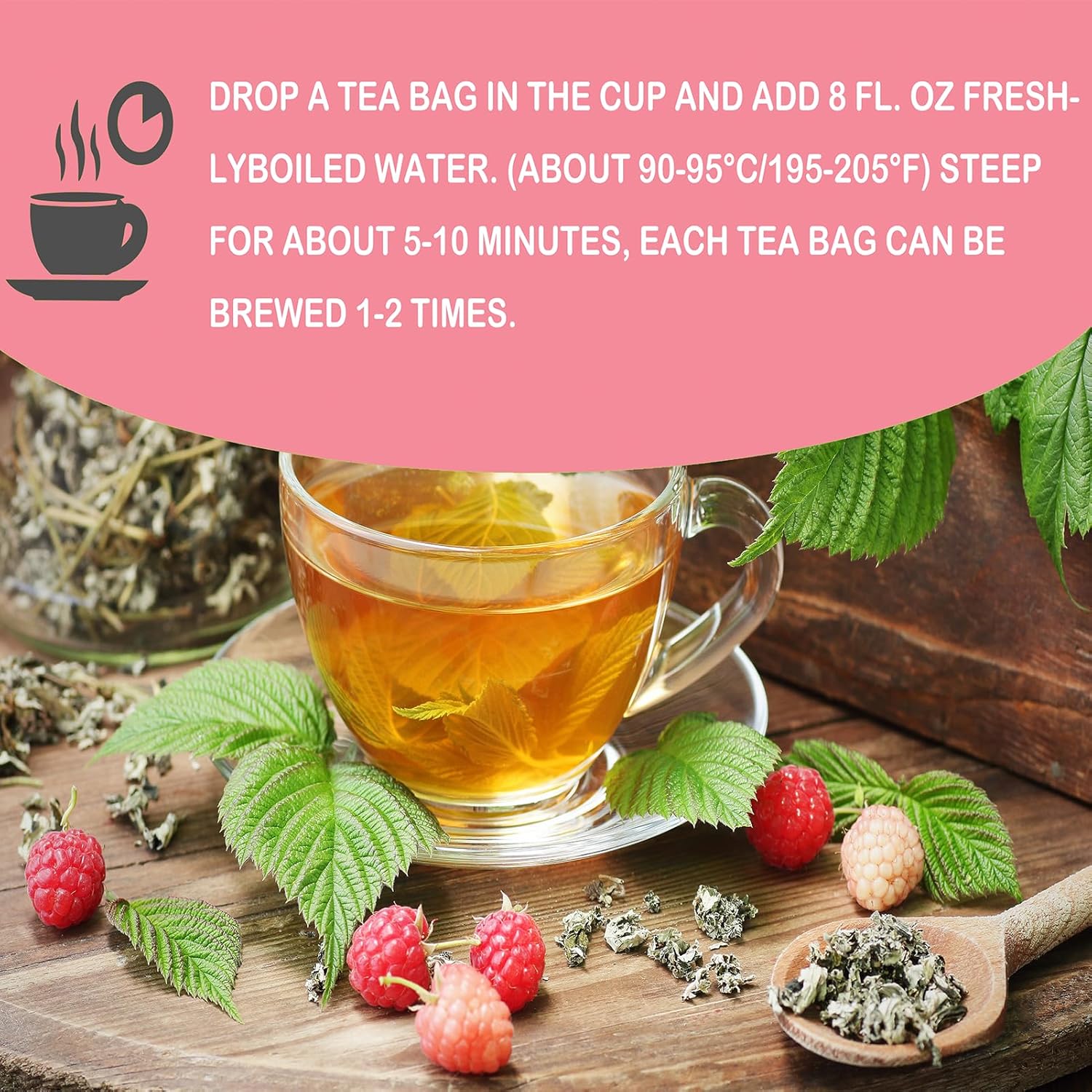 - 【Easy Brewing Instructions】: Brew each raspberry leaf tea bag with 300-400ml of 195-205°F (90-95°C) water for 5-10 minutes. Convenient and portable, enjoy a rich, distinctive, and aromatic herbal tea experience anytime, anywhere