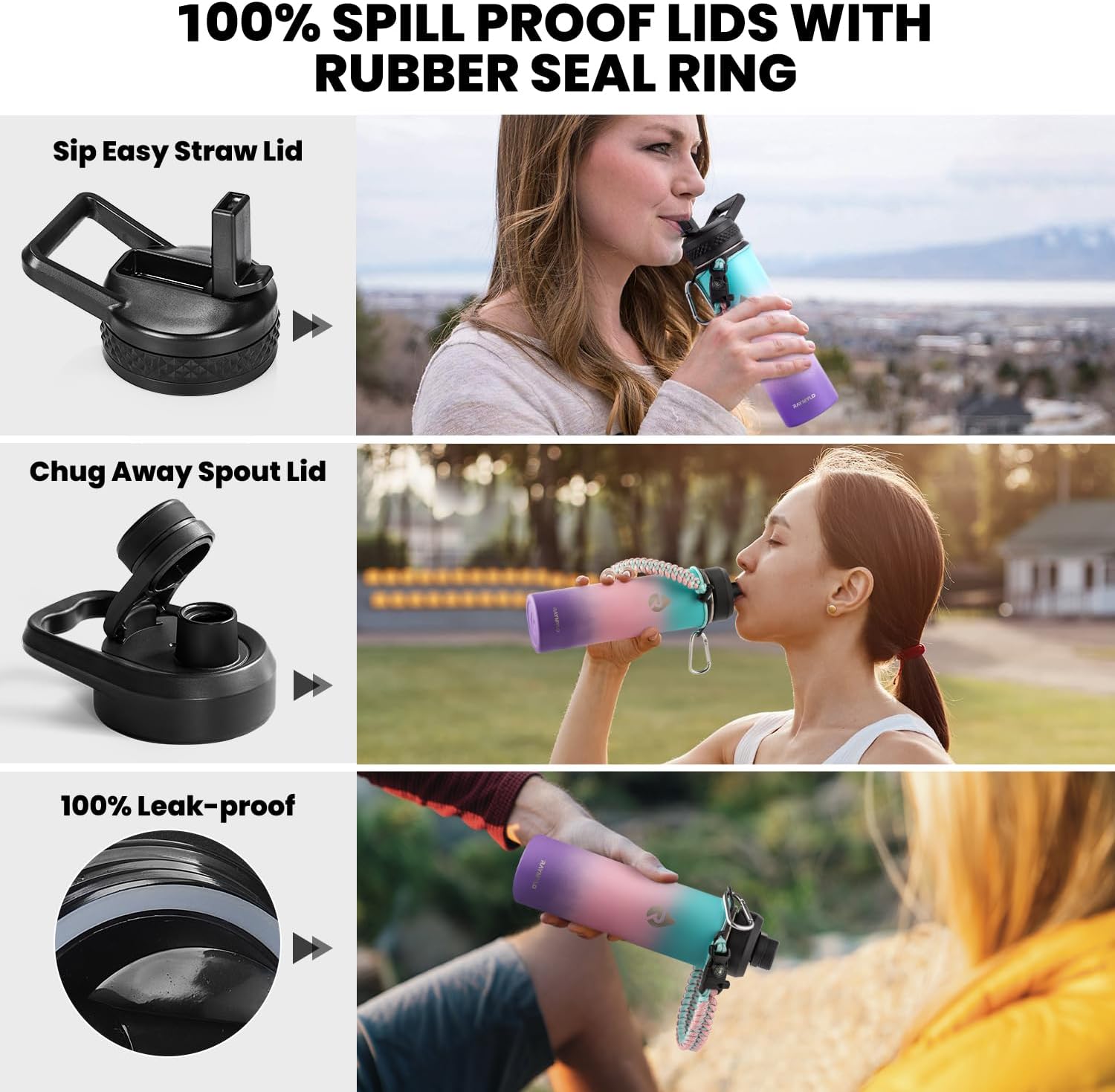 - Full Seal Leak-proof Lids: All scenario spout and straw lid with rubber seal ring ensures not a single drop leaks no matter how bumpy your journey gets.Straw lid allows for a quick refreshment without stopping you, while spout lid is great for proper hydration whenever you feel like a boost.Keeps your drinks fresh and spill-resistant on the go