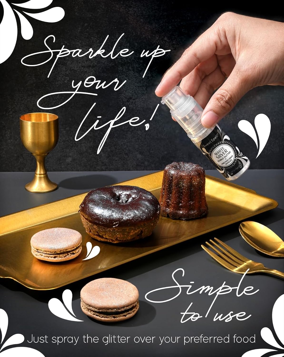Sweet Spell Edible Cake Glitter Spray – Shimmering Magic for Cakes Decorating & Cocktails – 100% Edible, Food-Grade, Vegan, Gluten-Free (White Silver)