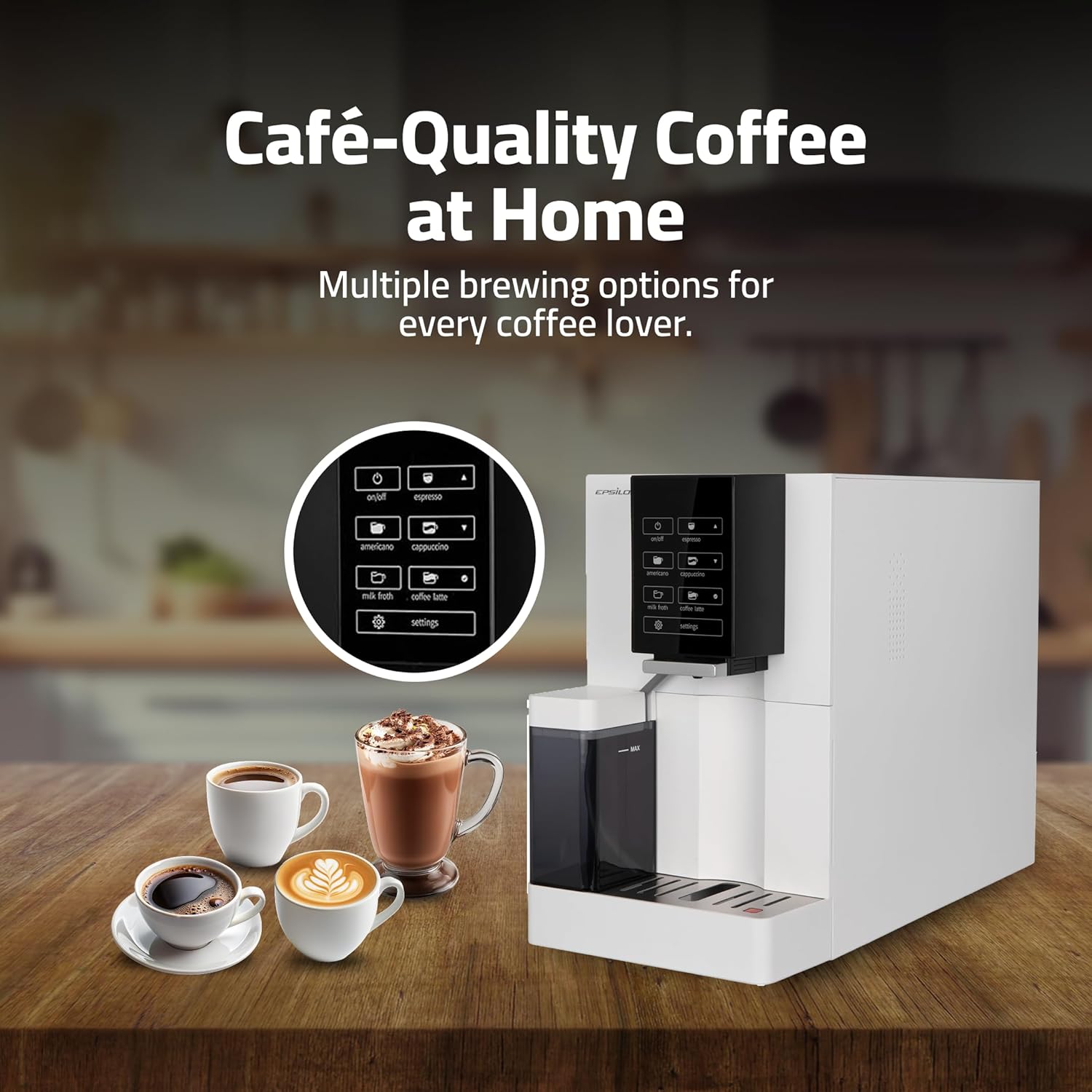 - Built-In Milk Frother for Lattes & Cappuccinos – This epsilon fully automatic espresso machine features a built-in milk frothing system. Simply add milk, and it will froth your milk to the perfect texture, allowing you to prepare lattes and cappuccinos with ease. You can customize the milk texture in three different levels.