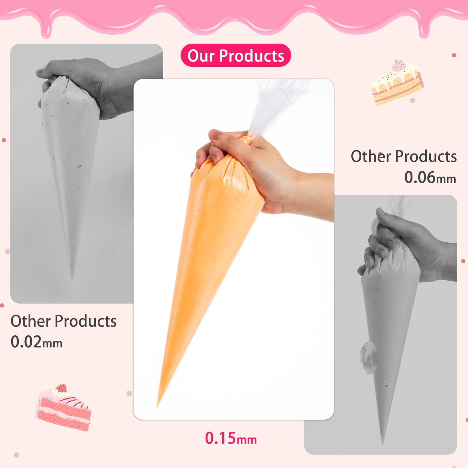 - Thickened Material: These cake decorating bags made from food grade HDPE. The extra thick, anti burst design withstands heavy pressure without tearing or leaking, giving you complete control over your frosting and decoration