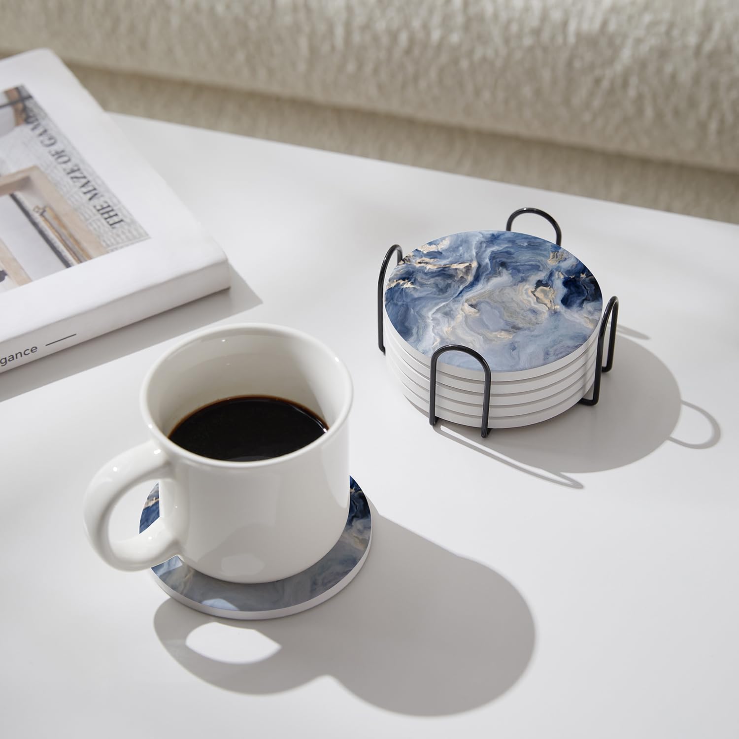 Set of 6 Abstract Navy Blue Marble Coasters with Holder, Absorbent Ceramic Drink Coasters for Table Protection, Housewarming Gifts for New Home