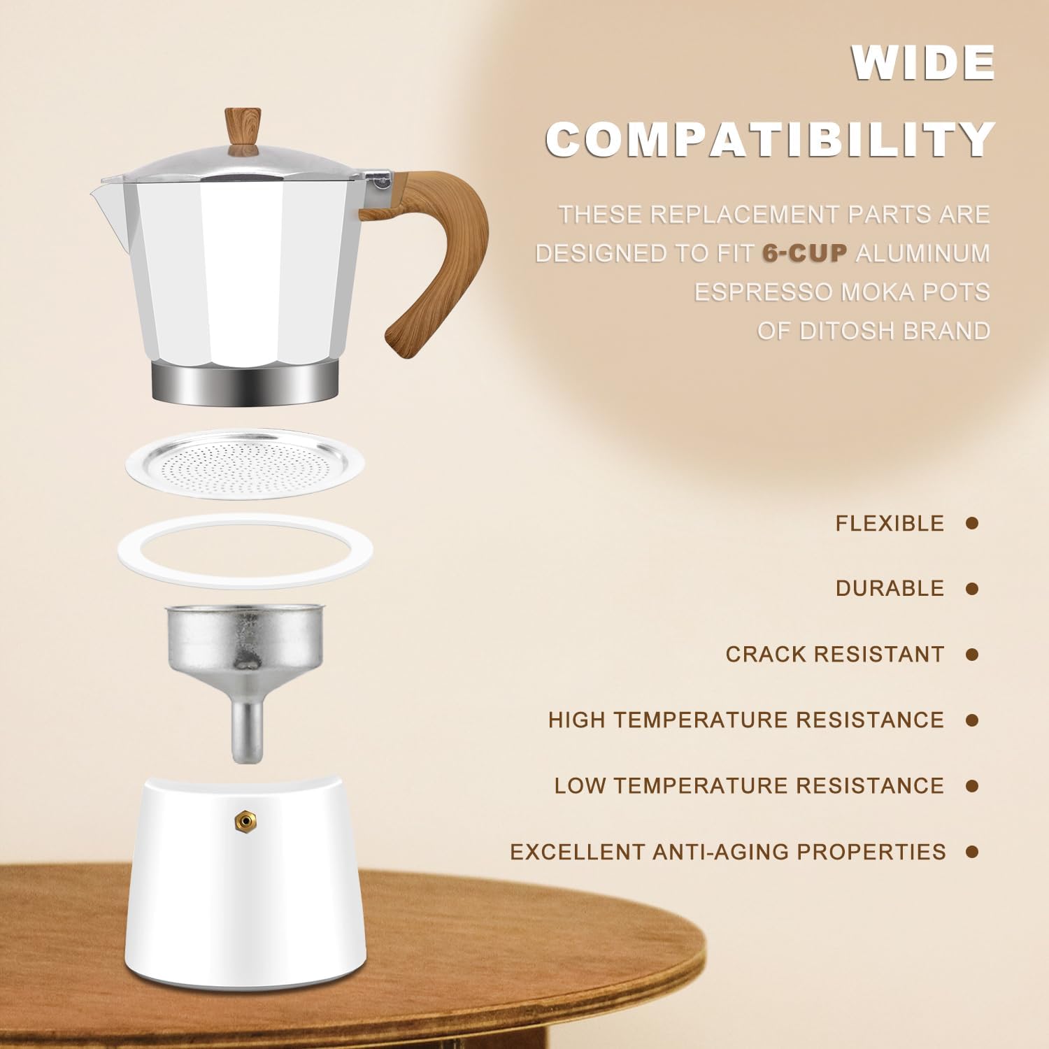 - Widely applicable: These replacement parts can be used for many types of aluminum espresso moka pots. They are suitable for a variety of temperature ranges and are very practical