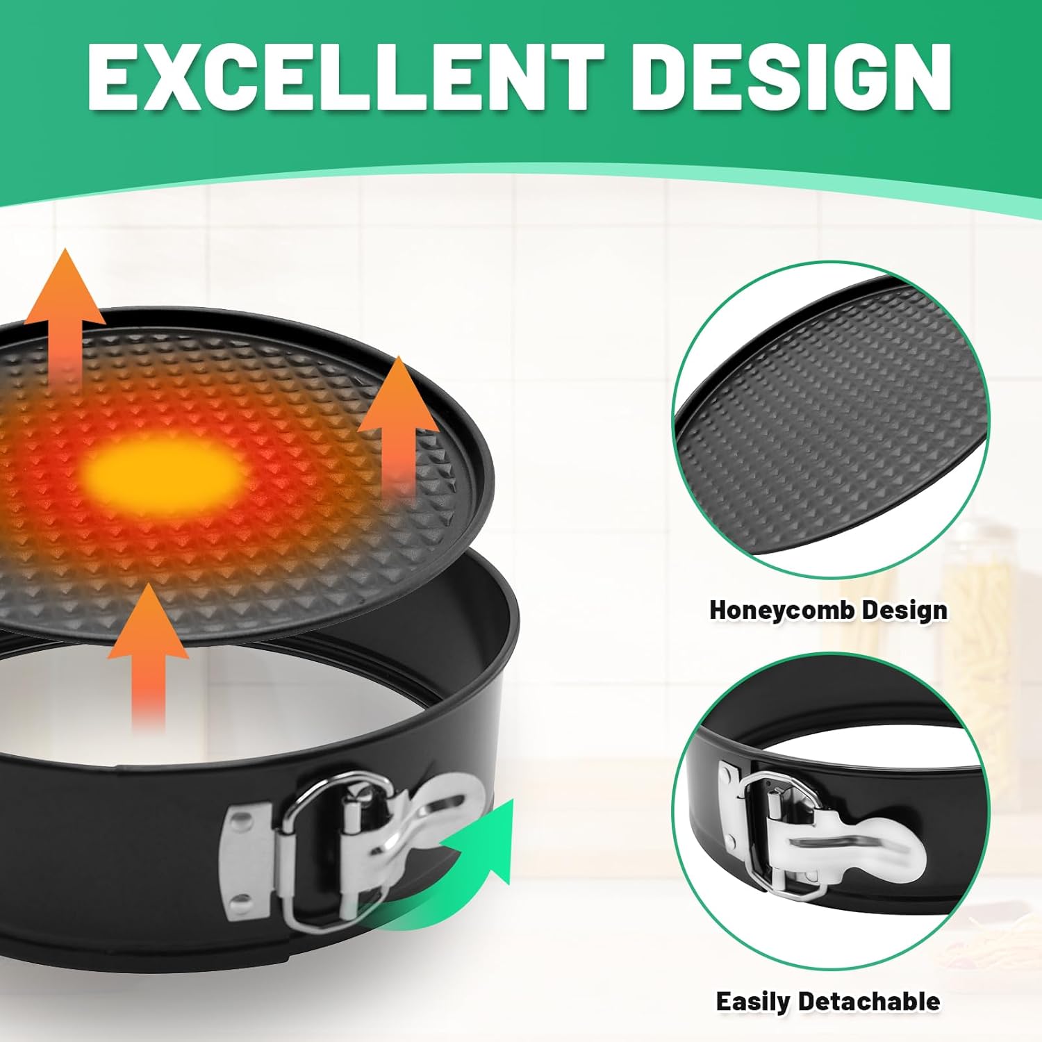 - Premium Springform Pan: This non-stick stainless-steel cheesecake pan is equipped with a heavy-gauge steel core that distributes heat evenly. Designed with interlocking layers for a perfect release, allowing you to make professional looking cheesecakes, coffee cakes, tarts and more. Once the spring hinge is closed, the honeycomb textured base ensures even heat flow, baking the layers of the cake consistently.