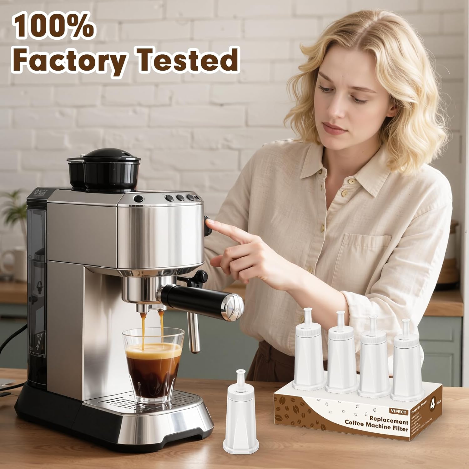 - Reliable Coffee Companion – Made with coconut-activated carbon and ion exchange resin, this espresso machine water filter helps prevent mineral buildup, reduces the need for descaling, and extends the life of your coffee machine.