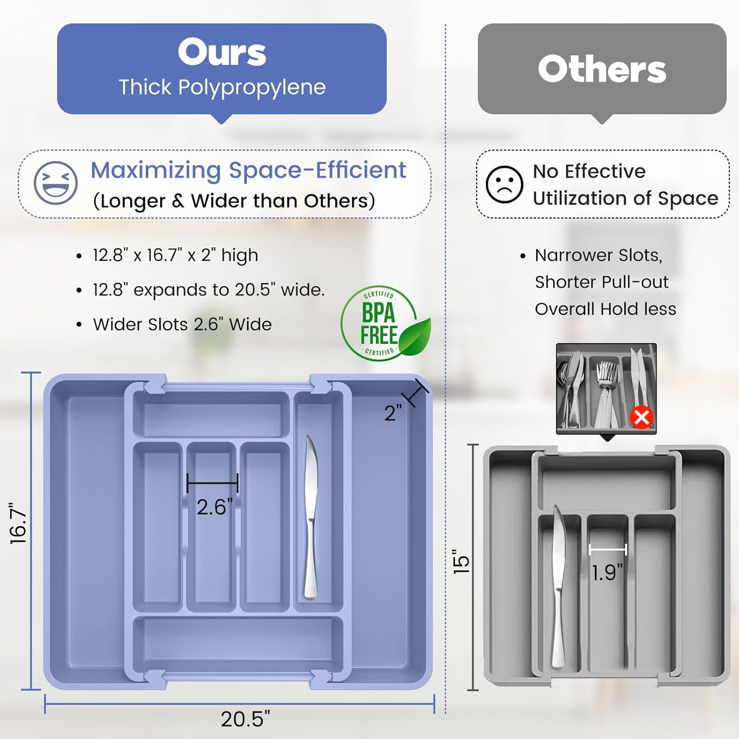 - Heavy-Duty Premium Material: Made of thick and heavy-duty food-grade safe plastic, the cutlery organizer is BPA-free so you can rest assured that it is safe to use with all forms of tableware. All parts of this flatware drawer organizer are easy to clean and top-shelf Dishwasher Safe.