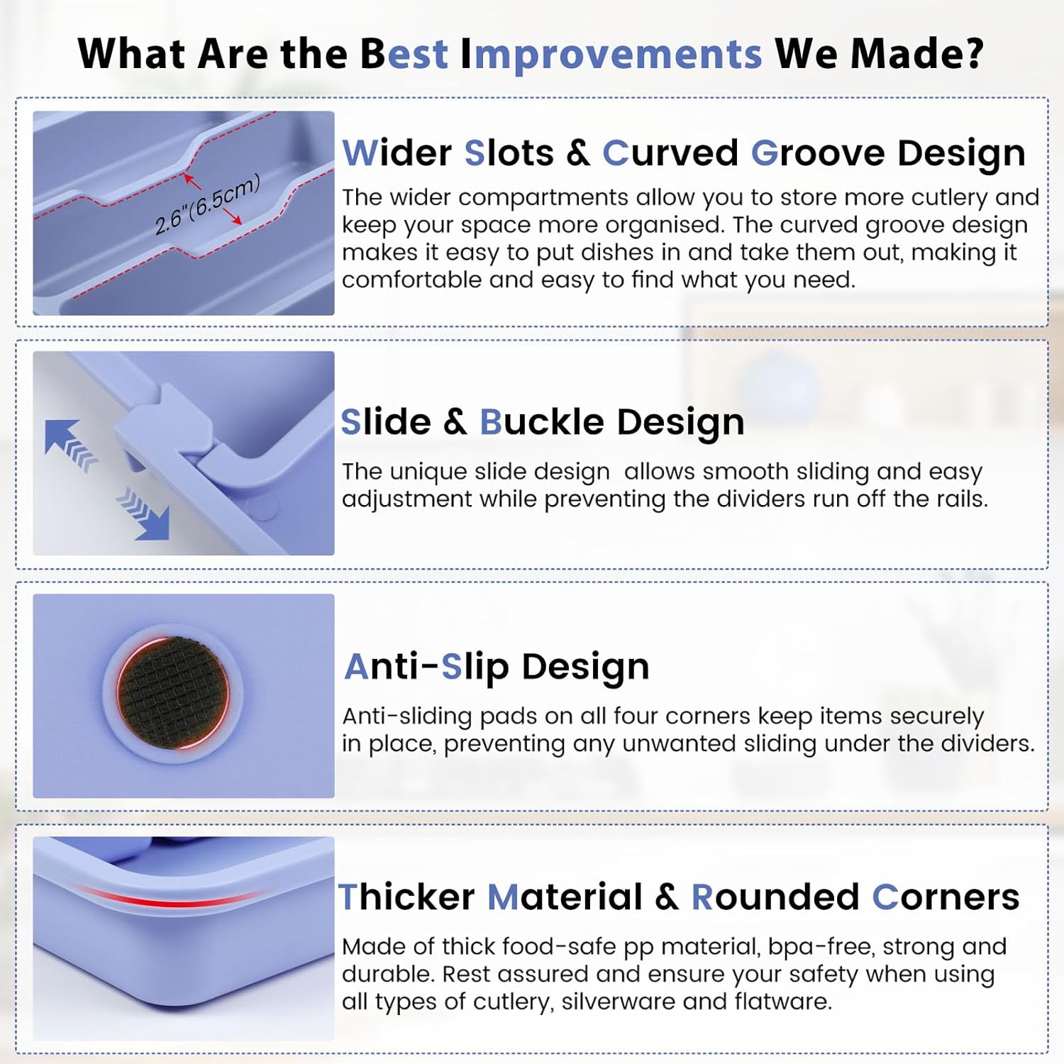 - Non-skid Silicone Feet: 8 strategically placed non-slip feets (not just four corners!) create superior grip on drawer surfaces. No more worrying about the flatware tray moving or tilting when you pull out the drawer.