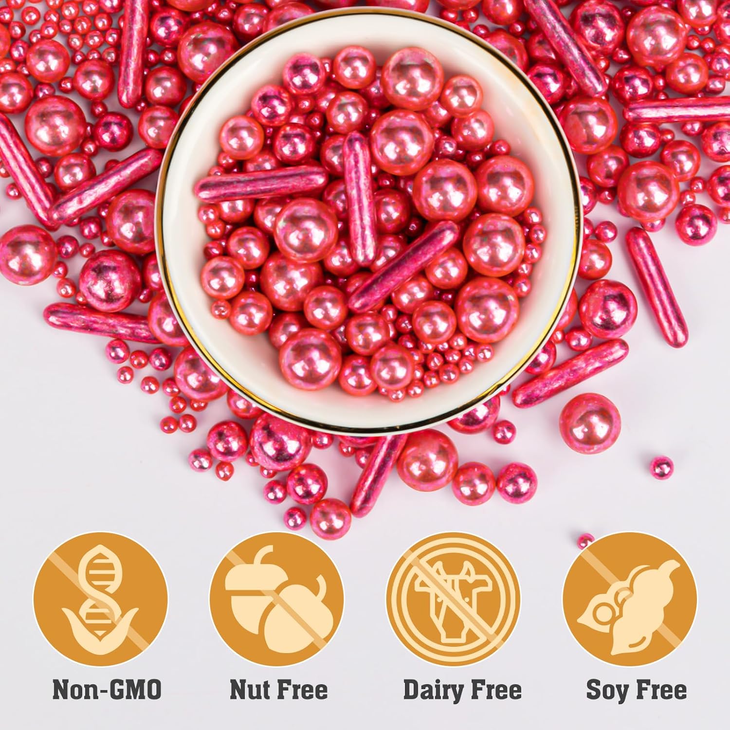 - 【100% Food-Grade Sugar Pearls】: Twisweet rose gold pearl rod sprinkles are made with international food-grade ingredients and a pure, vegan-friendly formula, adhering to 12 allergen-free production standards. Crafted from natural cane sugar crystals and manufactured according to FDA guidelines, these sugar sprinkles are free from preservatives, nuts, dairy, and gluten, ensuring they’re both delicious and suitable for a variety of diets.