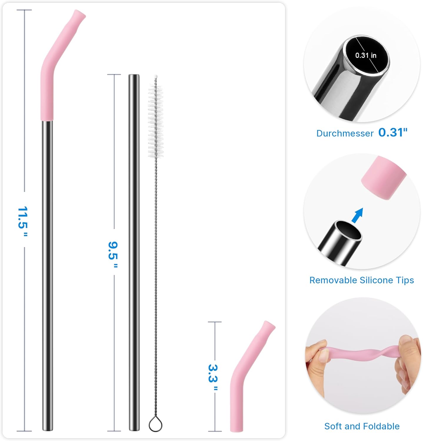 - 【Silicone Tips】 Our straws are paired food-grade silicone tips for a safe and comfortable sipping experience. The soft and flexible silicone tips ensure a gentle touch while preventing any potential harm to your teeth or lips