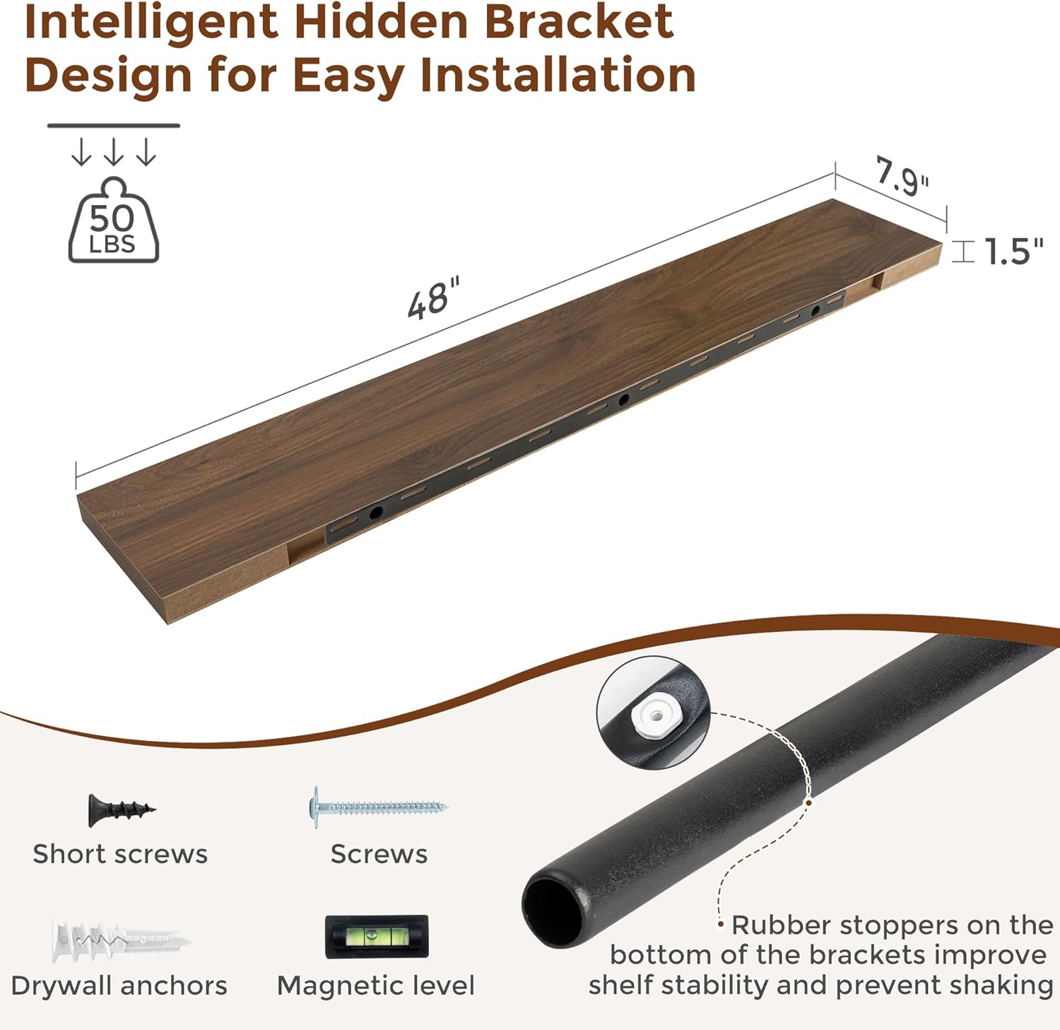 Heimlove 48 Inch Floating Shelves for Wall 8 Inch Deep Walnut Shelves Set of 2,Wall Mounted Rustic Wood Long Floating Shelf,Large Display & Storage Shelf with Invisible Brackets
