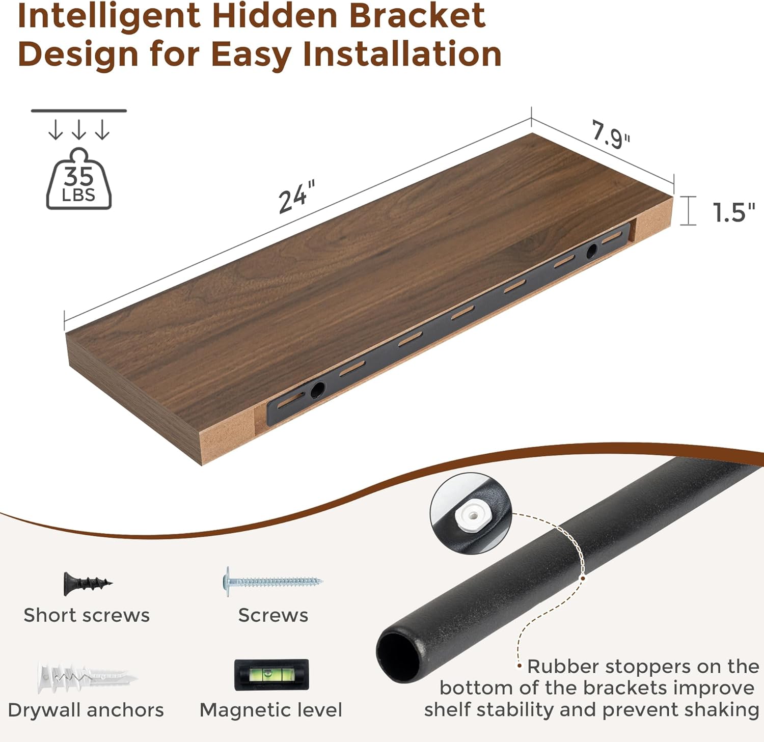 - 【Easy To Install】This walnut floating shelves not only come with stainless-steel galvanized invisible brackets, but also equipped a fixing screw at the bottom to fix the shelf on the support rod, which solves the problem of sliding and is not easy to damage, and can be used for a long time. Instructions, magnetic level, drywall anchors, and screws included.