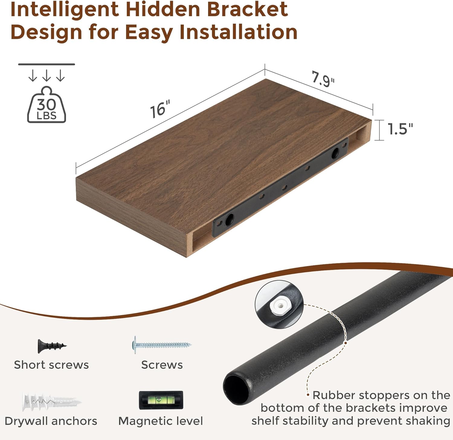 Heimlove 16 Inch Floating Shelves for Wall Walnut Shelves Set of 2,Wall Mounted Rustic Wood 8 Inch Deep Floating Shelf with Invisible Brackets for Bedroom Kitchen Living Room