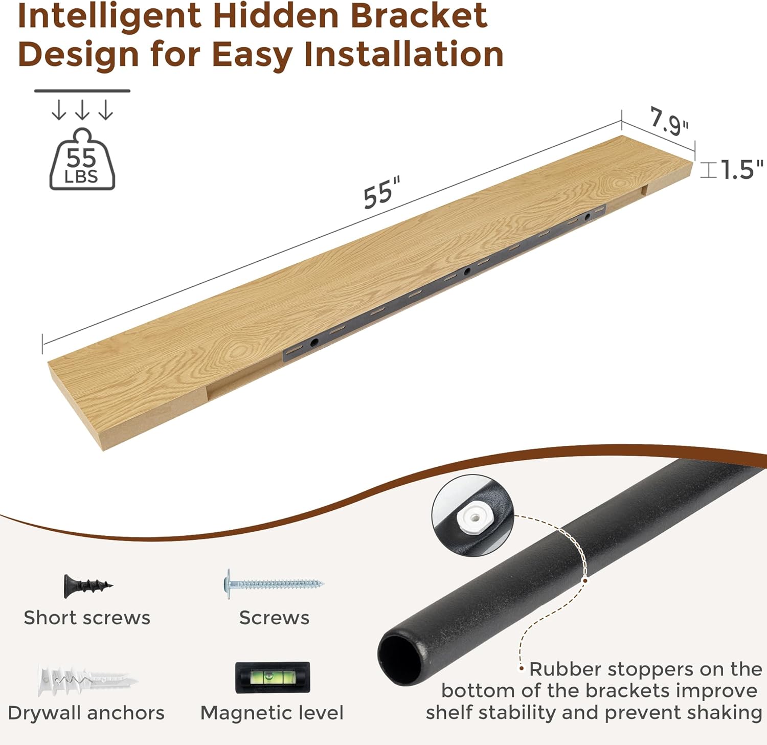 Heimlove 55 Inch Floating Shelves for Wall 8 Inch Deep Oak Shelves Set of 2,Wall Mounted Rustic Wood Long Floating Shelf,Large Extra Display & Storage Shelf with Invisible Brackets